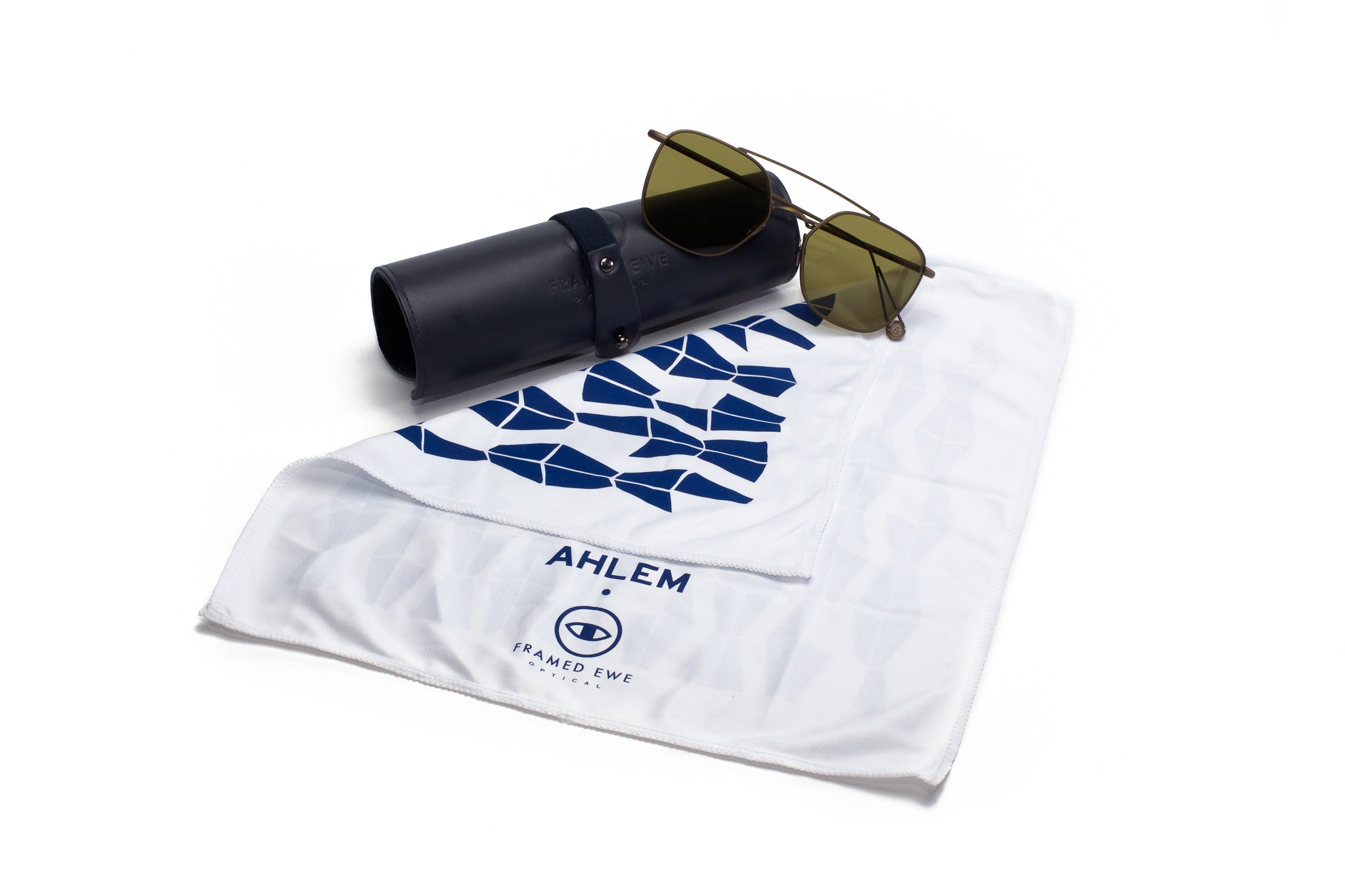 This special collaboration package includes an AHLEM • FRAMED EWE engraved frame, a custom vegan leather eyewear case and a microfiber cleaning cloth.