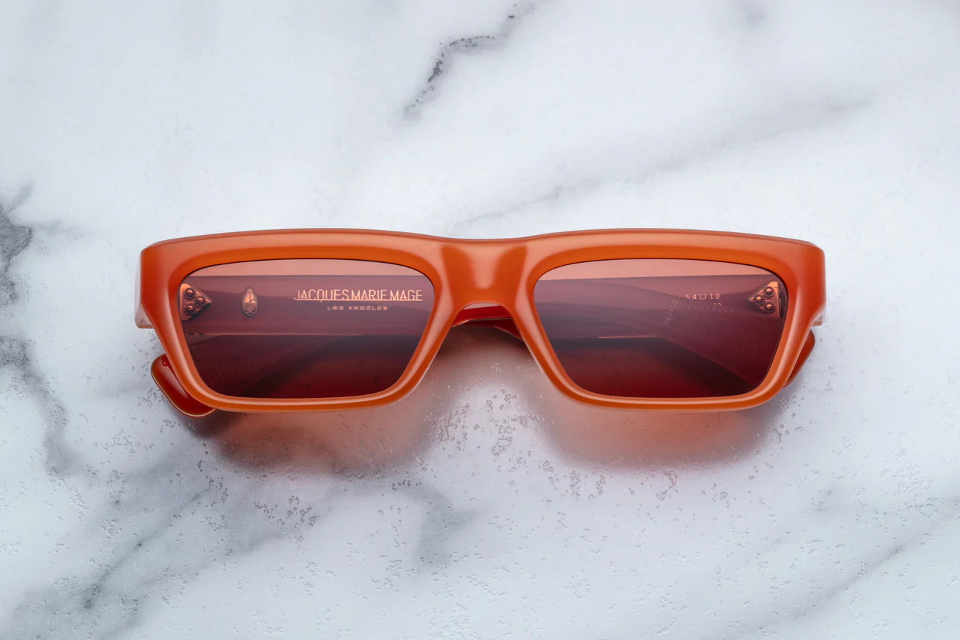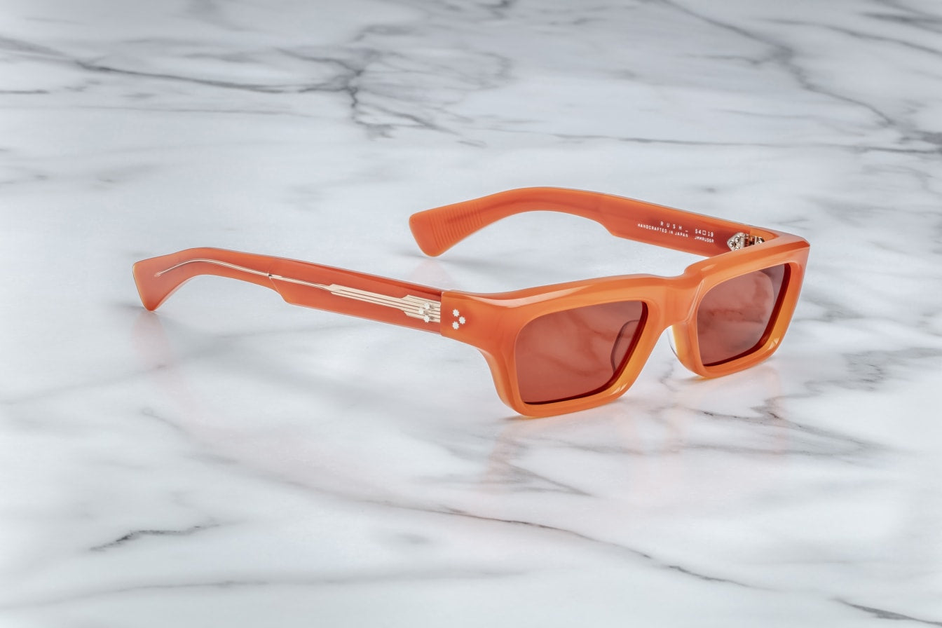 ORANGE 8MM CURED CELLULOSE ACETATE FRAME WITH CUSTOM DOUBLE LAMINATED ACETATE TEMPLES FEATURING PRECIOUS METAL HARDWARE AND ORANGE LENSES