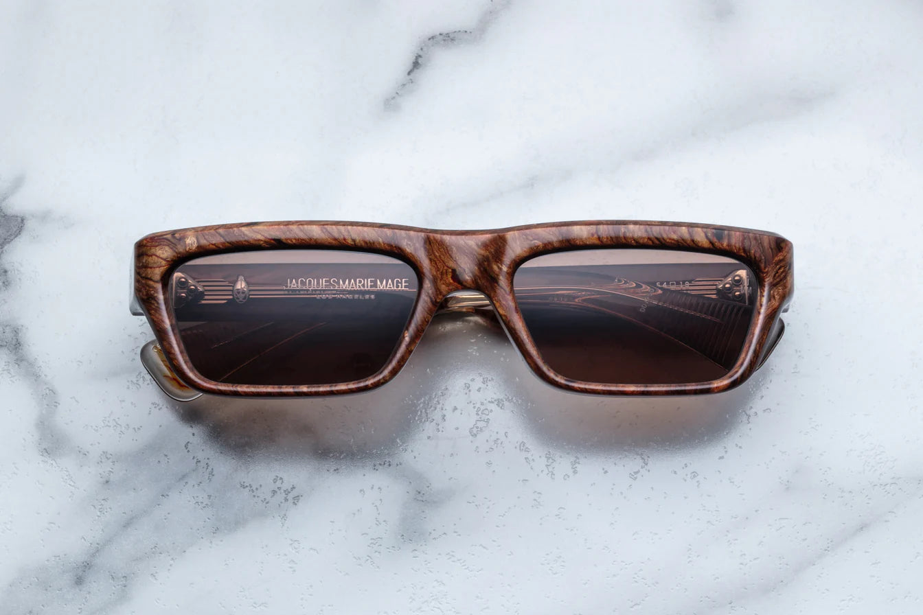 BROWN 8MM CURED CELLULOSE ACETATE FRAME WITH CUSTOM DOUBLE LAMINATED ACETATE TEMPLES FEATURING PRECIOUS METAL HARDWARE AND BROWN LENSES