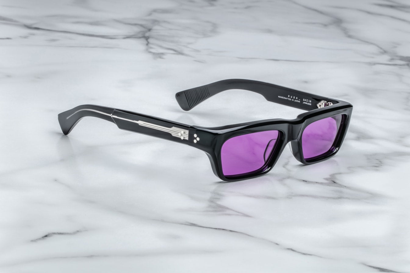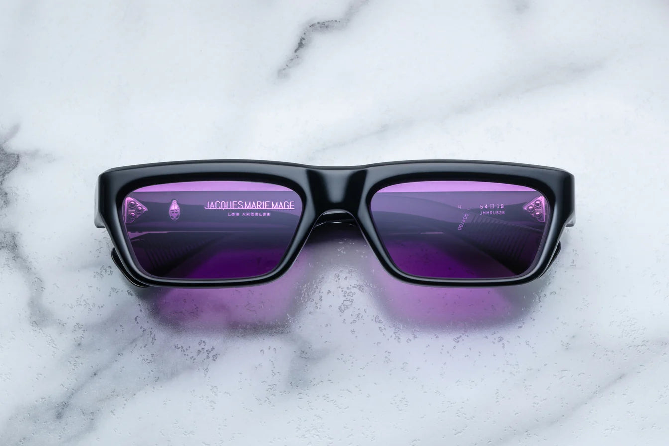 BLACK 8MM CURED CELLULOSE ACETATE FRAME WITH CUSTOM DOUBLE ACETATE TEMPLES FEATURING PRECIOUS METAL HARDWARE AND PURPLE LENSES