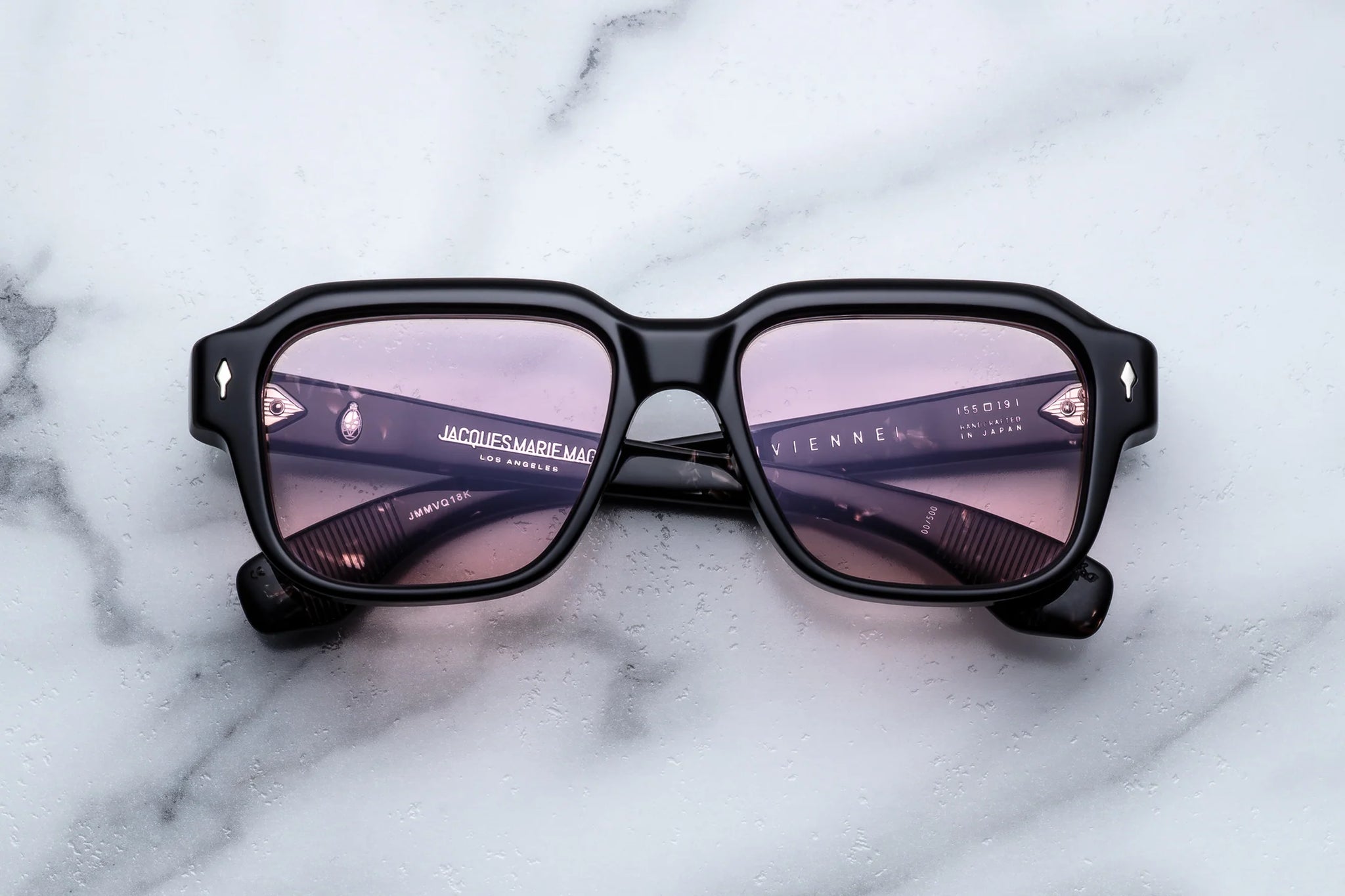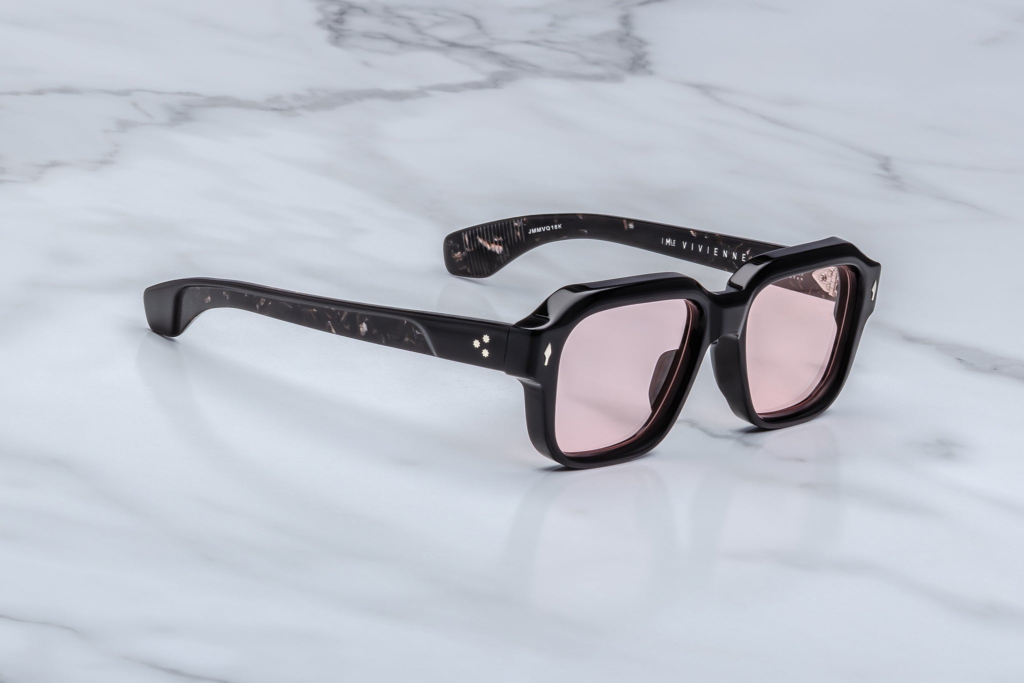 BLACK 10MM CURED CELLULOSE ACETATE FRAME WITH CUSTOM DOUBLE-LAMINATED ACETATE TEMPLES FEATURING PRECIOUS METAL HARDWARE AND PINK LENSES
