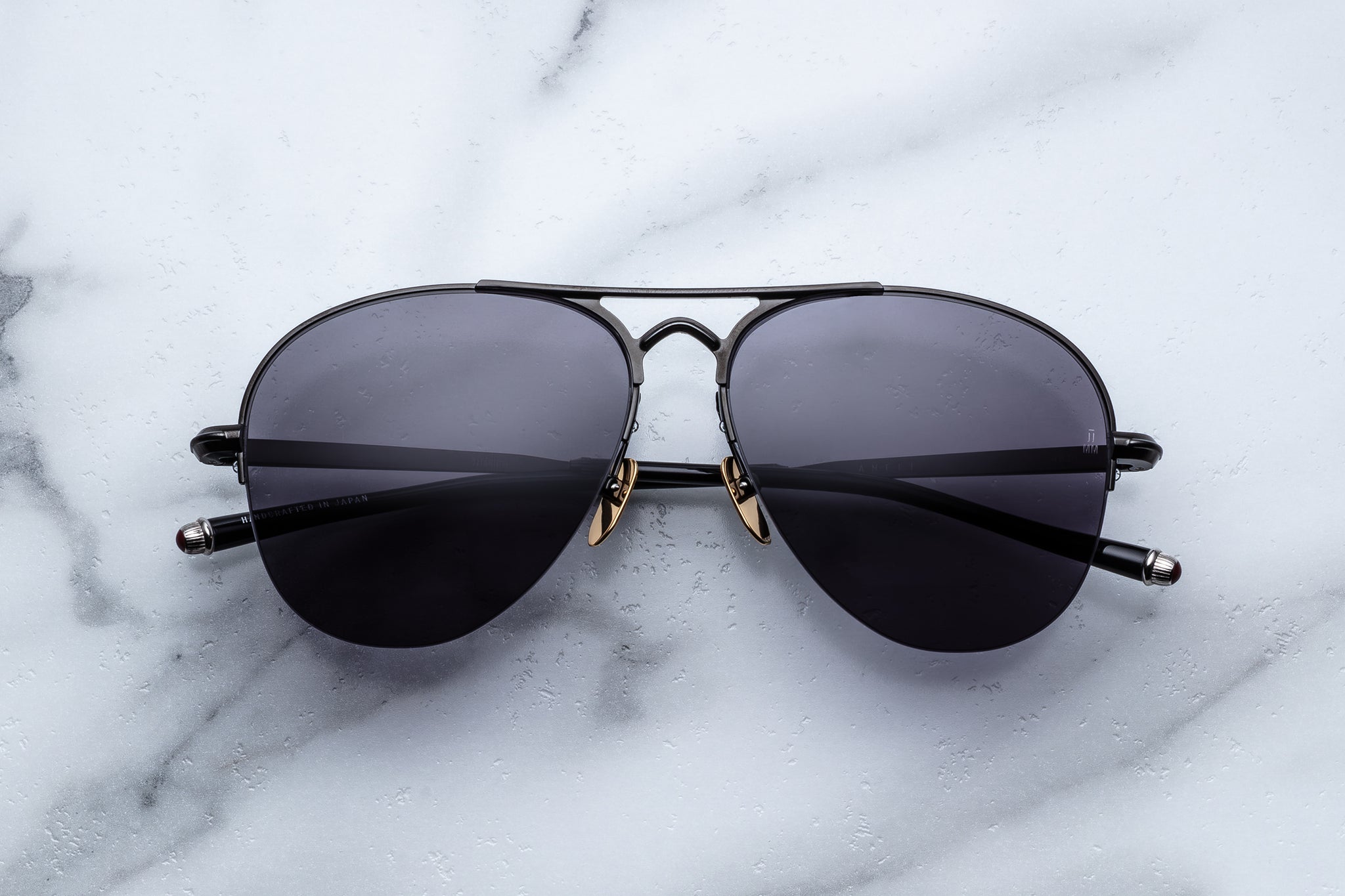 Semi-rimless titanium aviators with a medium fit, featuring arched double-bridge with hairline details and Art Deco-inspired acetate temple tips with domed, handpainted epoxy details.