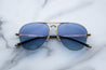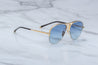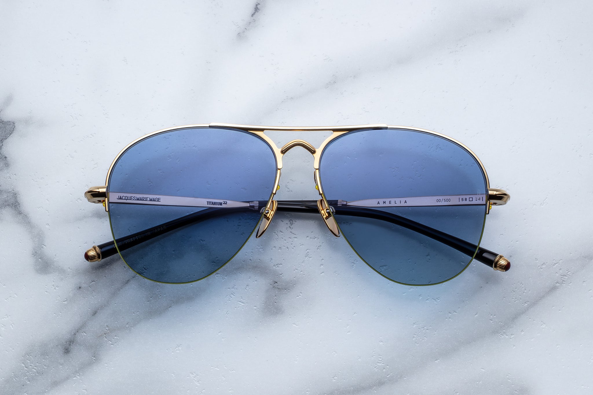 MOON GOLD-FINISHED 100% BETA TITANIUM FRAME WITH BLACK CURED CELLULOSE ACETATE TEMPLE SLEEVES AND BLUE GRADIENT LENSES