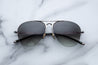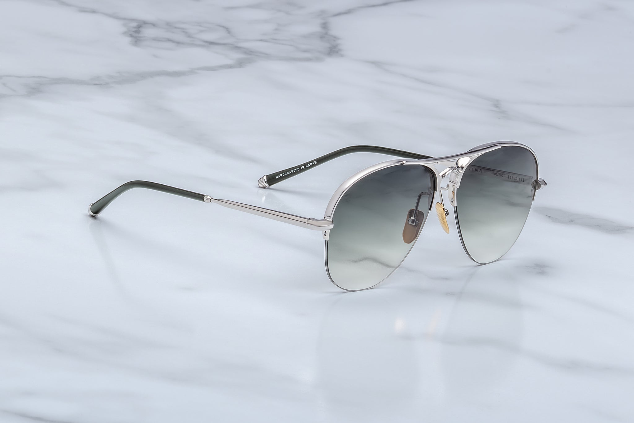 SILVER-FINISHED 100% BETA TITANIUM FRAME WITH GREEN CURED CELLULOSE ACETATE TEMPLE SLEEVES AND GREEN GRADIENT LENSES