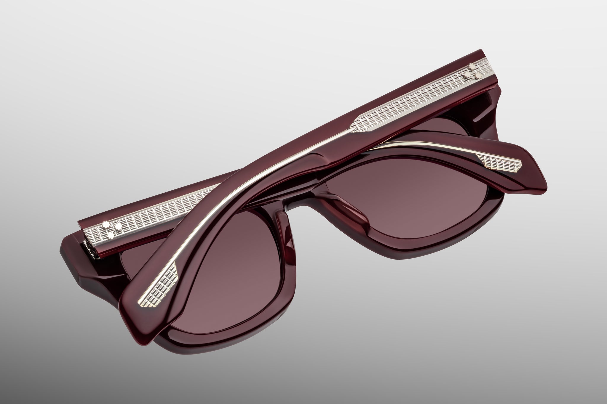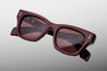10MM CURED CELLULOSE ACETATE FRAME IN BORDEAUX EMPIRE WITH CUSTOM DOUBLE-LAMINATED TEMPLES COMPOSED OF CLEAR EXTERIORS AND BORDEAUX EMPIRE INTERIORS, COMPLEMENTED BY ARMORLITE 6-BASE LENSES IN RUBY WITH BACKSIDE ANTI-REFLECTIVE TREATMENT