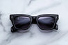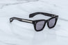 10MM CURED CELLULOSE ACETATE FRAME IN POLISHED BLACK WITH CUSTOM DOUBLE-LAMINATED TEMPLES COMPOSED OF CLEAR EXTERIORS AND POLISHED BLACK INTERIORS, COMPLEMENTED BY ARMORLITE 6-BASE LENSES IN NIMBUS WITH BACKSIDE ANTI-REFLECTIVE TREATMENT
