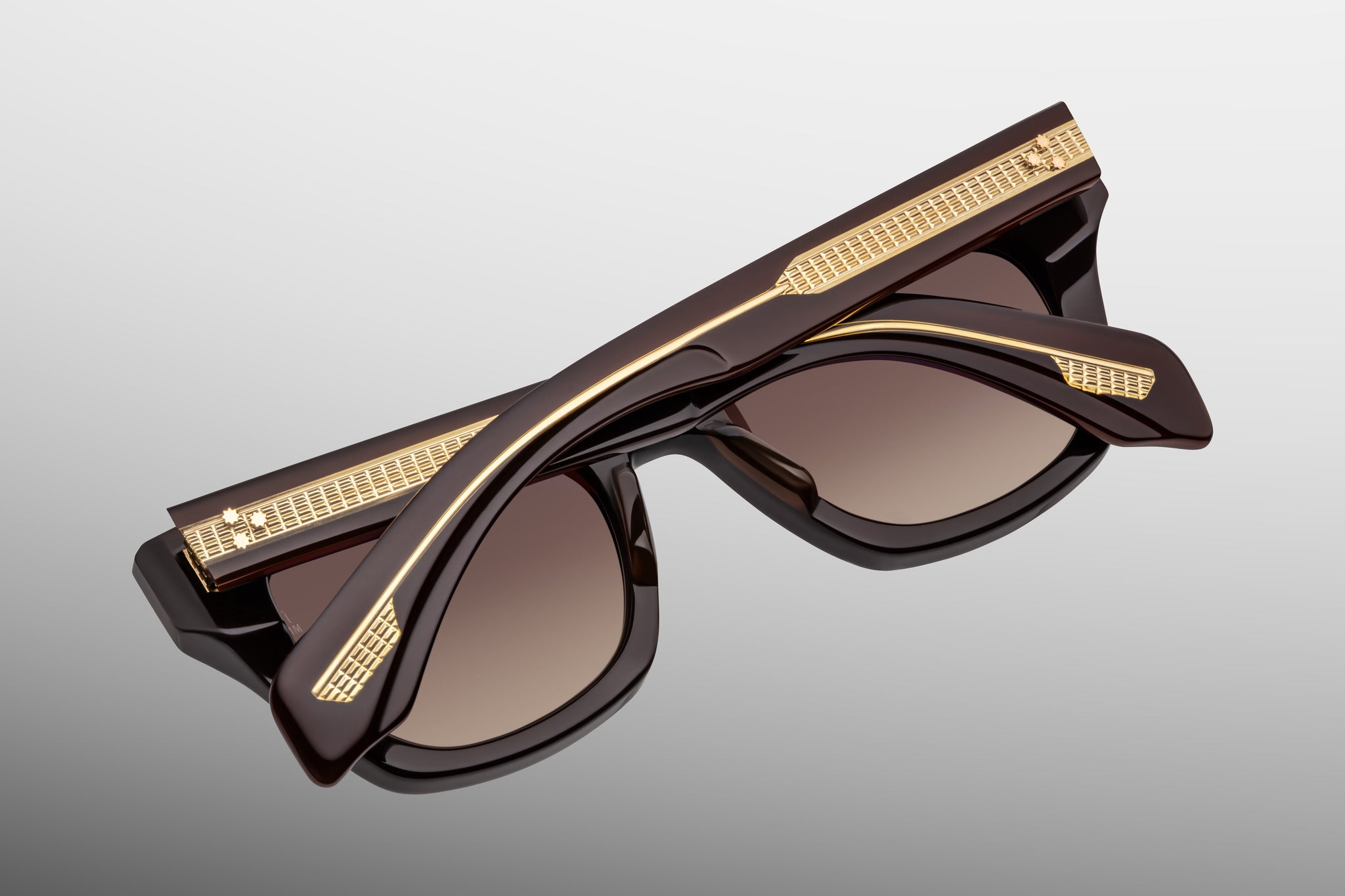 10MM CURED CELLULOSE ACETATE FRAME IN DARK BROWN WITH CUSTOM DOUBLE-LAMINATED TEMPLES COMPOSED OF CLEAR BEIGE EXTERIORS AND DARK BROWN INTERIORS, COMPLEMENTED BY ARMORLITE 6-BASE LENSES IN CHOCO GRADIENT WITH BACKSIDE ANTI-REFLECTIVE TREATMENT