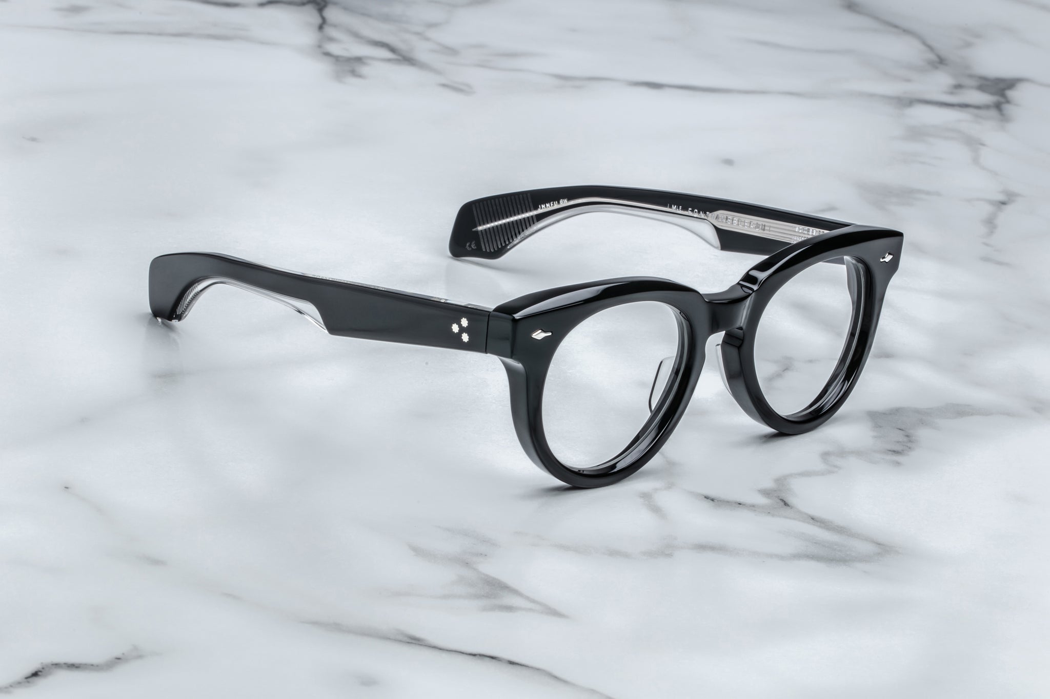 BLACK 10MM CURED CELLULOSE ACETATE FRAME WITH CUSTOM DOUBLE LAMINATED TEMPLES FEATURING PRECIOUS METAL HARDWARE AND DEMO LENSES