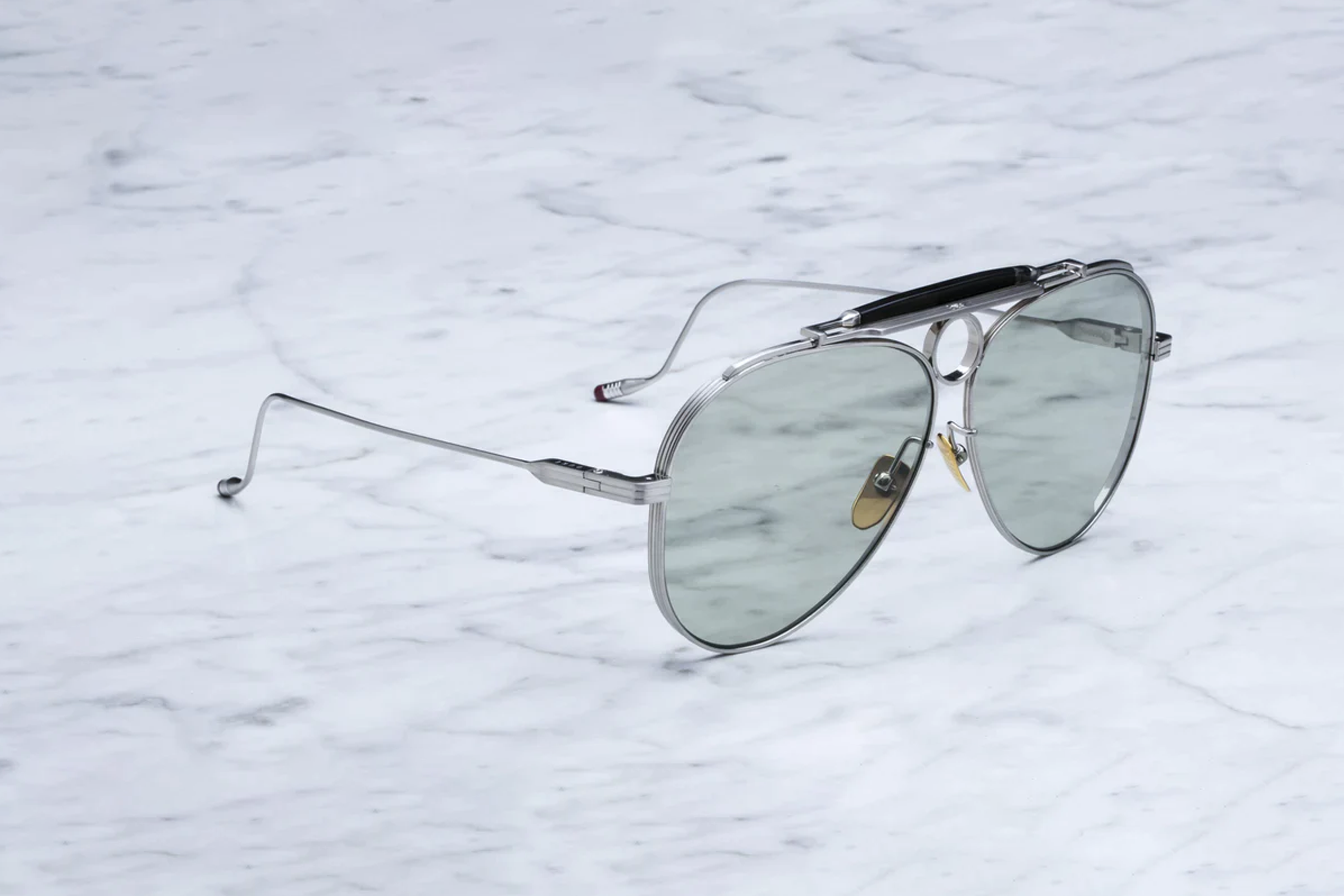 SILVER 100% BETA TITANIUM FRAME WITH BLACK TORTOISE CURED CELLULOSE ACETATE ACCENT AND GREEN LENSES