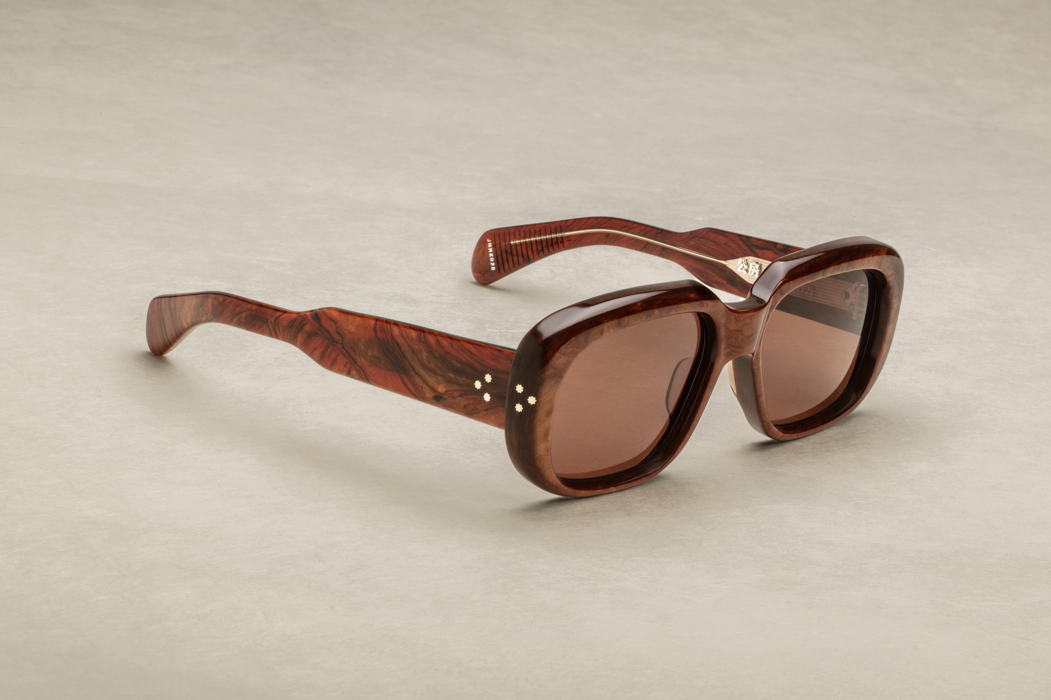 BROWN 10MM CURED CELLULOSE ACETATE FRAME CUSTOM DOUBLE LAMINATED ACETATE TEMPLES FEATURING PRECIOUS METAL HARDWARE AND BROWN LENSES