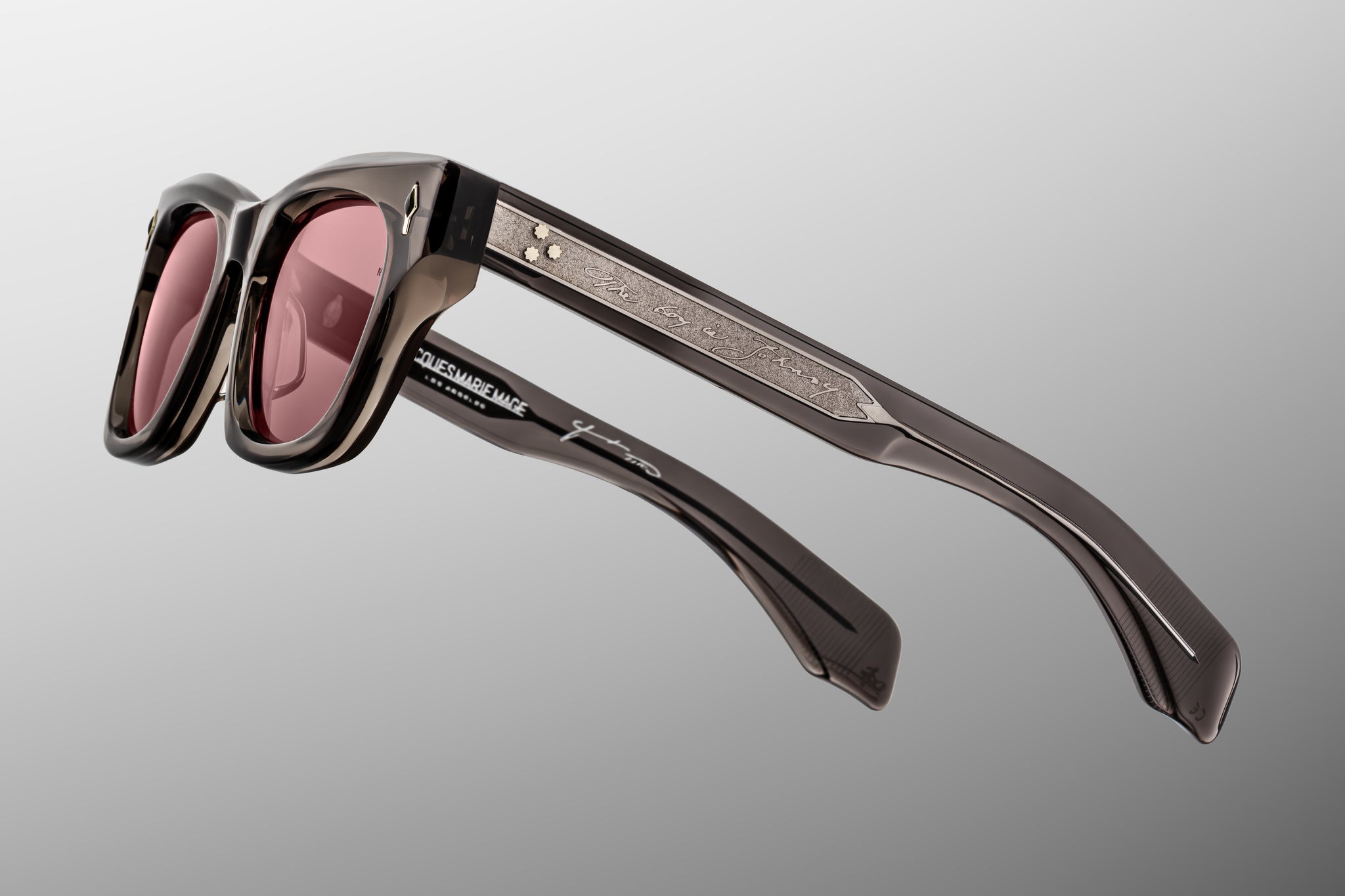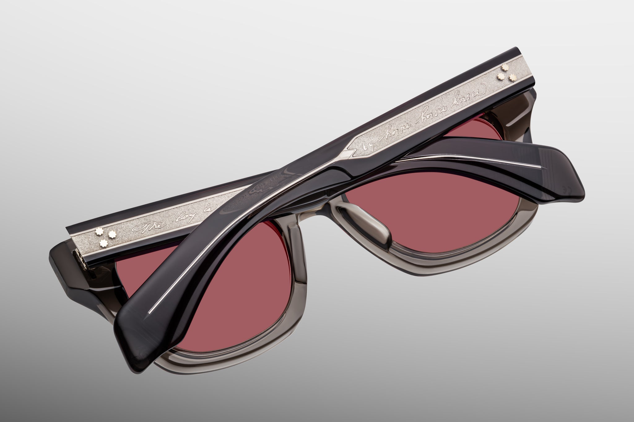An Icon of JMM reimagined by a living icon, handcrafted in a color story named after a song written by Patti Smith, “Mauvais sang,” which is French for "bad blood" and was used by the poet Arthur Rimbaud (1854-1891) to describe a chaotic or restless state. Here, these limited-edition, ‘60s-inspired spectacles are composed of Polished Warm Gray plant-based acetate, complemented by Armorlite lenses in Ruby, with our signature arrowhead front-pins in Sterling Silver featuring Bloodstone inlays, as well as exposed custom wirecores finely engraved with lyrics from Smith’s song “Land,” and inner temples foil-stamped with the artist’s signature in Silver.
