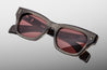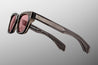 10MM CURED CELLULOSE ACETATE FRAME IN POLISHED WARM GRAY, WITH CUSTOM DOUBLE-LAMINATED TEMPLES WITH CLEAR GRAY EXTERIORS AND POLISHED WARM GRAY INTERIORS, COMPLEMENTED BY ARMORLITE 6-BASE LENSES IN RUBY WITH BACKSIDE ANTI-REFLECTIVE TREATMENT