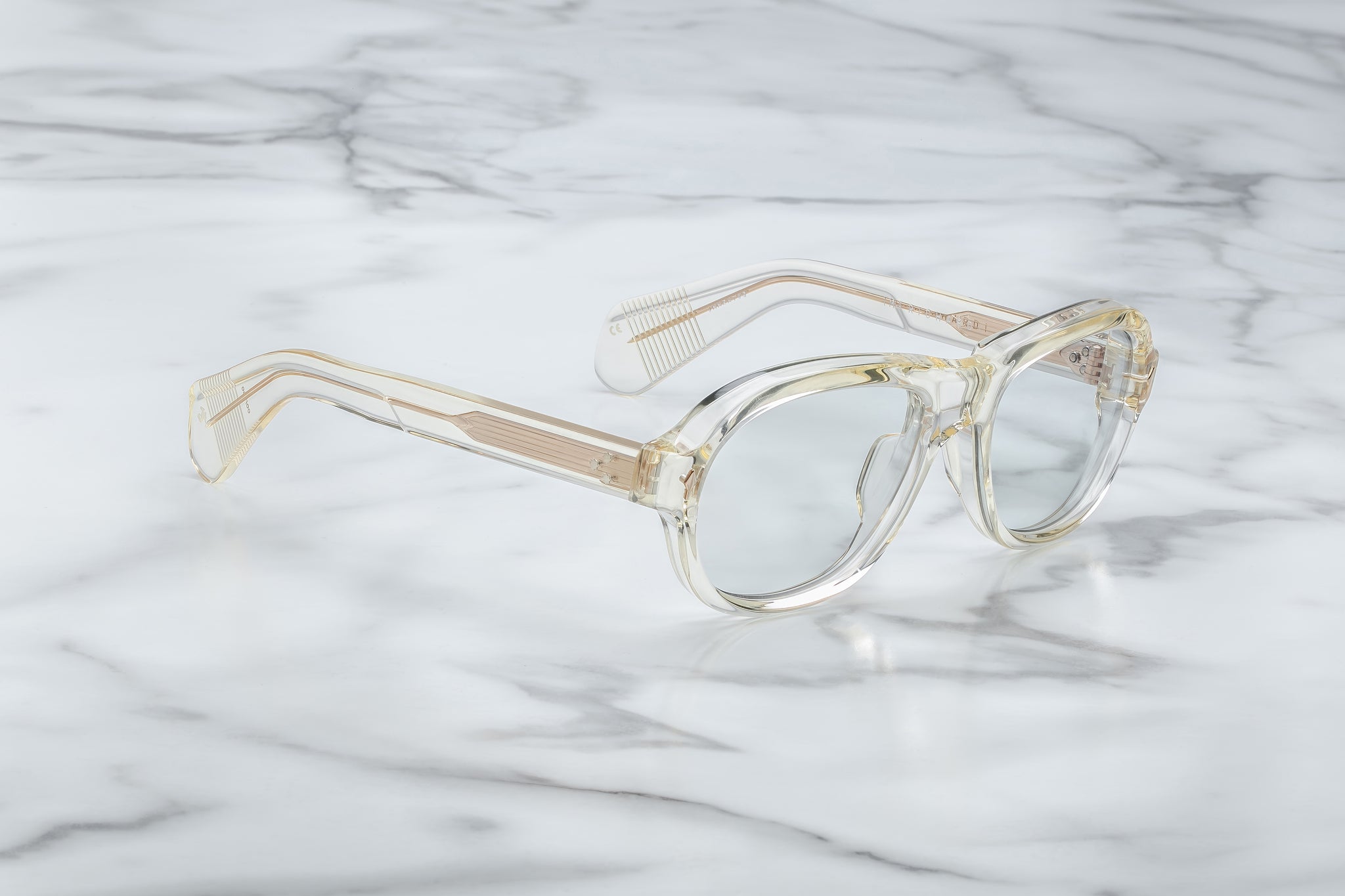 YELLOW 10MM CURED CELLULOSE ACETATE FRAME WITH CUSTOM DOUBLE LAMINATED ACETATE TEMPLES FEATURING PRECIOUS METAL HARDWARE AND SUPERLIGHT BLUE LENSES