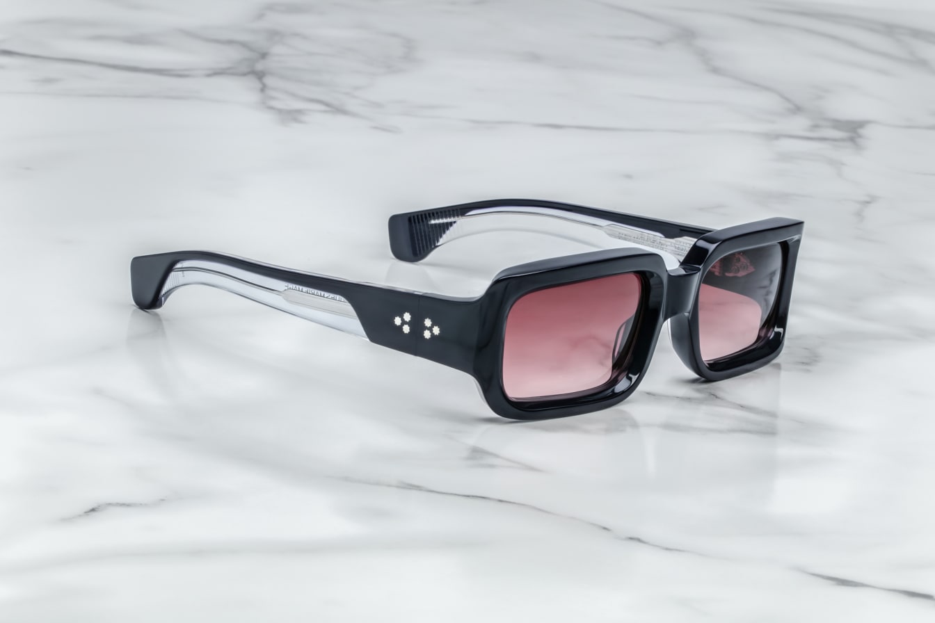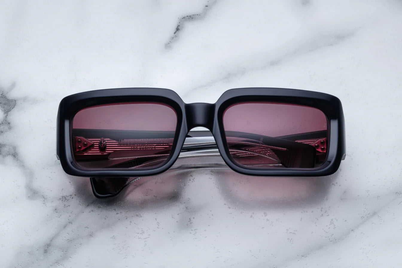 BLACK 8MM CURED CELLULOSE ACETATE FRAME WITH CUSTOM DOUBLE LAMINATED ACETATE TEMPLES FEATURING PRECIOUS METAL HARDWARE AND BLACK LENSES