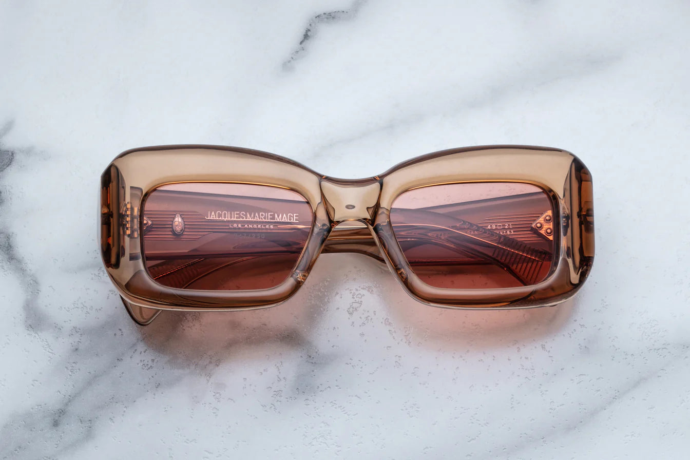 TAN 8MM CURED CELLULOSE ACETATE FRAME WITH CUSTOM DOUBLE LAMINATED ACETATE TEMPLES FEATURING PRECIOUS METAL HARDWARE AND TAN LENSES