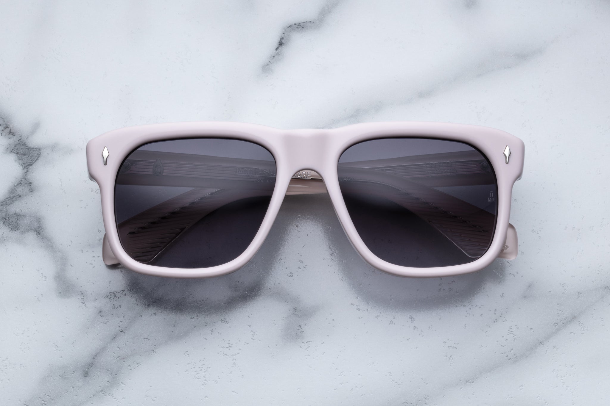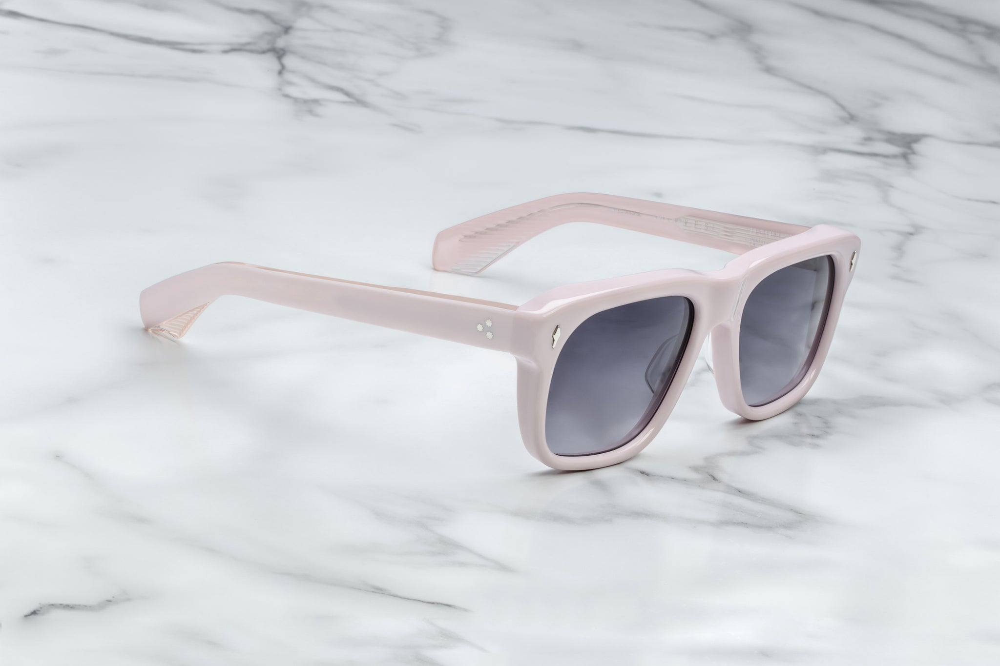 PINK 10MM CURED CELLULOSE ACETATE FRAME WITH CUSTOM ACETATE TEMPLES FEATURING PRECIOUS METAL HARDWARE AND BLUE LENSES