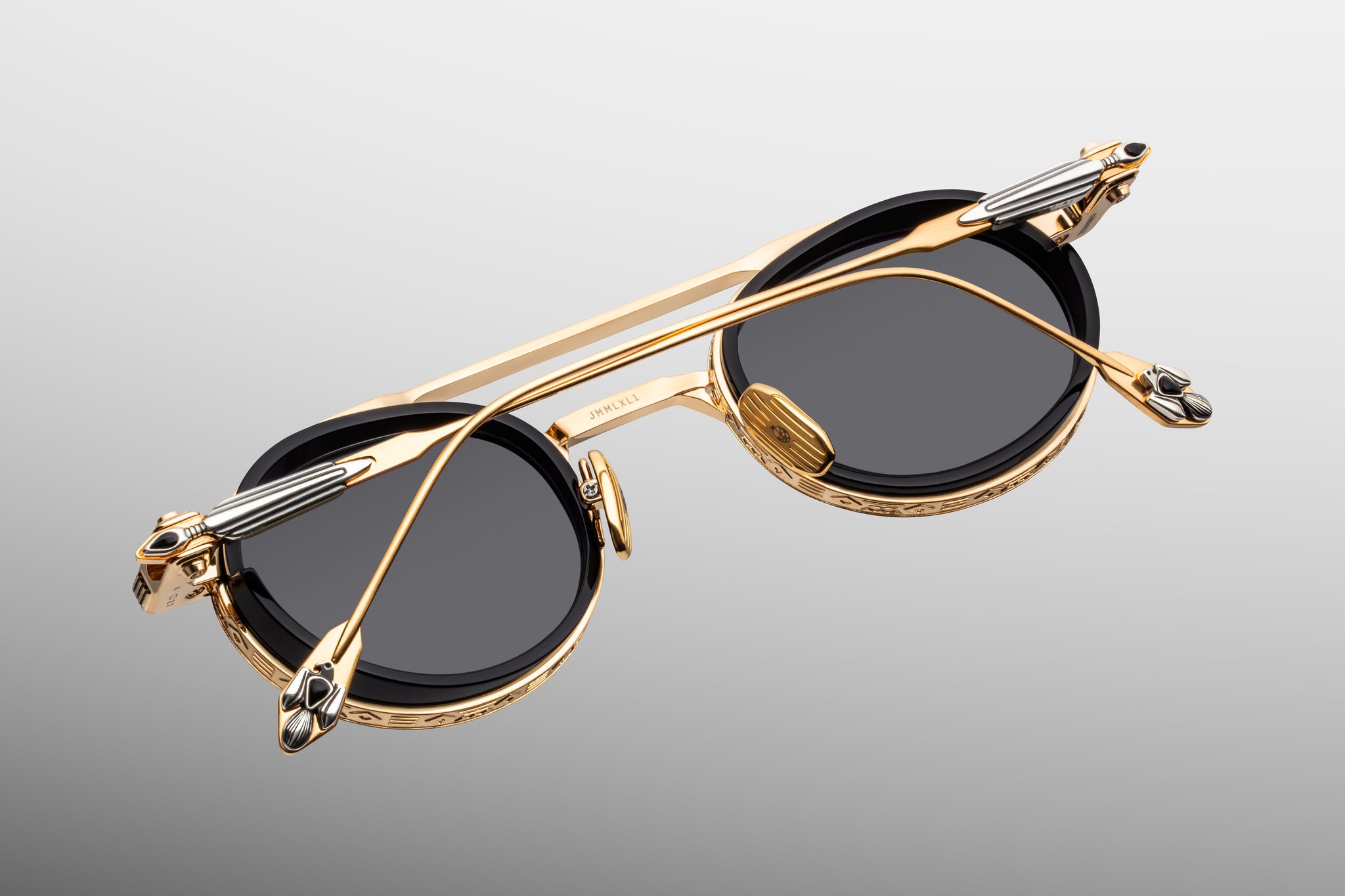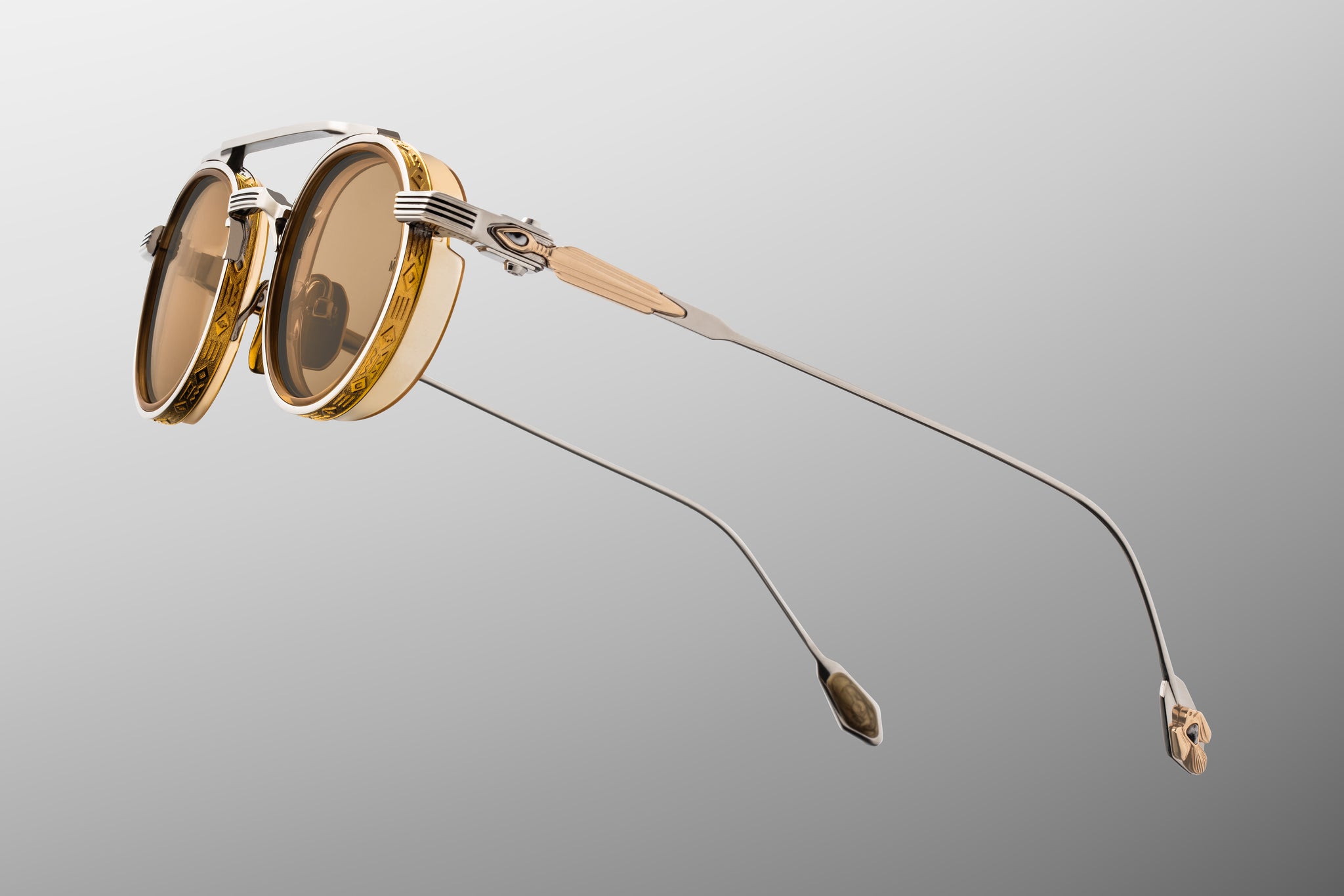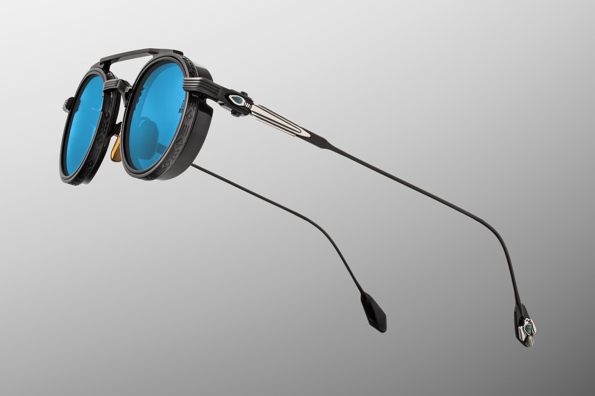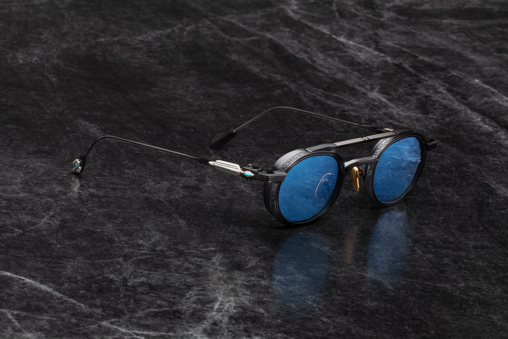 Circular, ‘50s-inspired titanium spectacles with lens-rims finely engraved with a Chimayo motif, complemented by acetate lens-rim inserts that extend into eye shields, temples with dual-toned arrow adornments and diamond-shaped tips with ‘thunderbird’ medallions, both accented with inlays of ethically sourced gemstones.