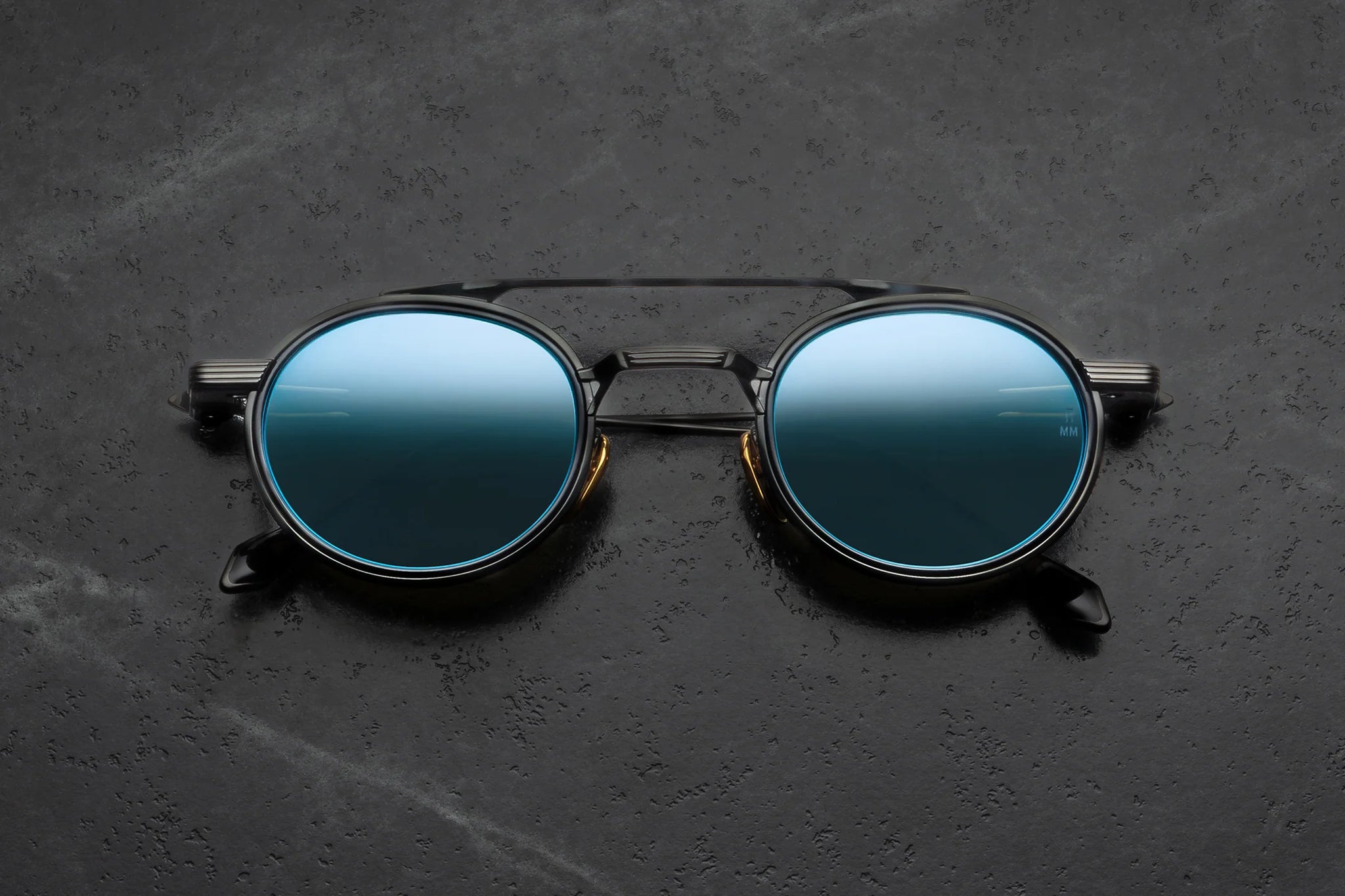 100% BETA TITANIUM SPECTACLES IN POLISHED BLACK WITH SILVER PALLADIUM ACCENTS, COMPLEMENTED BY 8MM ACETATE LENS-RIM INSERTS IN BLACK, AND CROWN MINERAL GLASS 4-BASE LENSES IN LAGOON MIRROR WITH BACKSIDE ANTI-REFLECTIVE TREATMENT