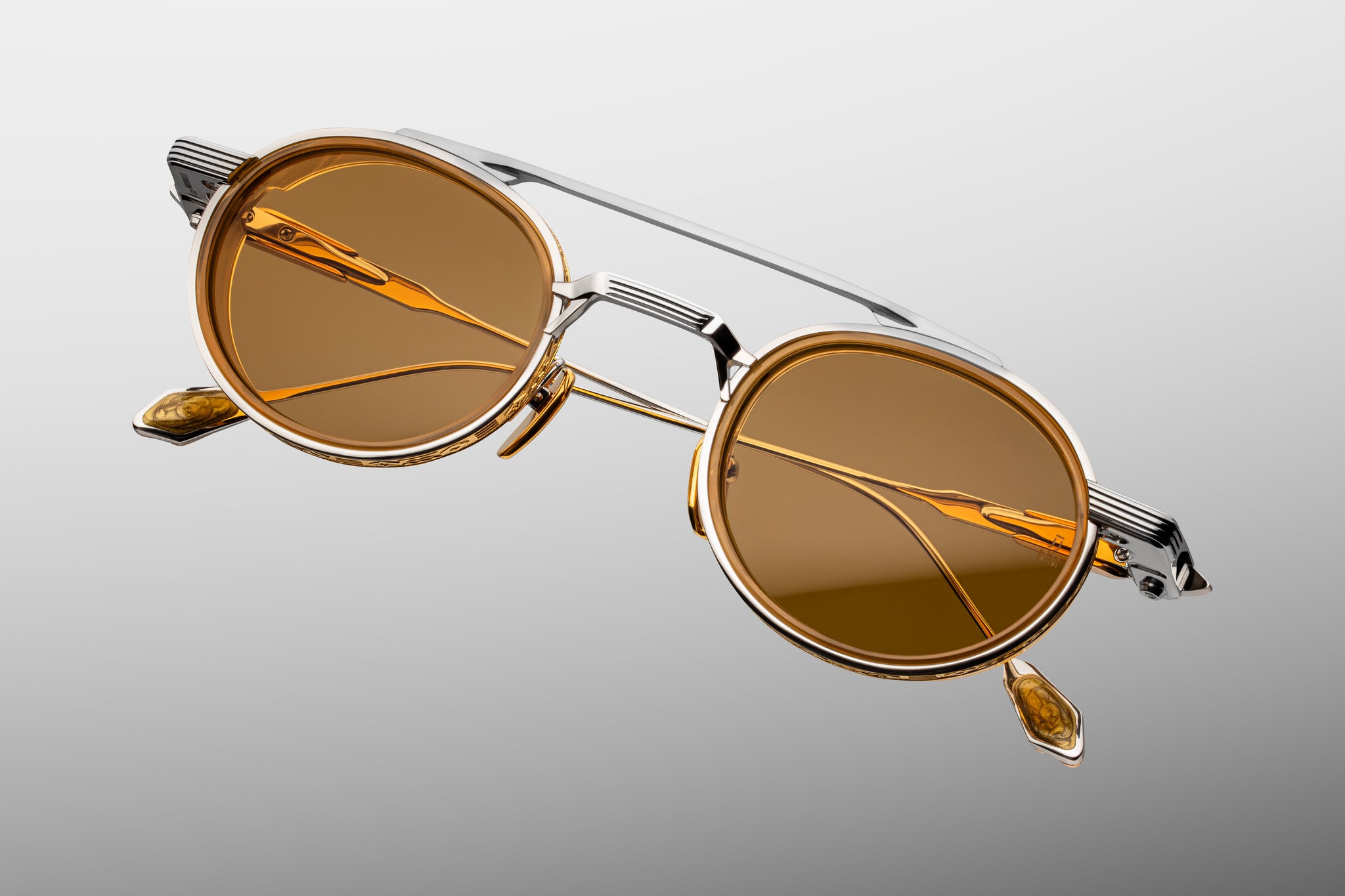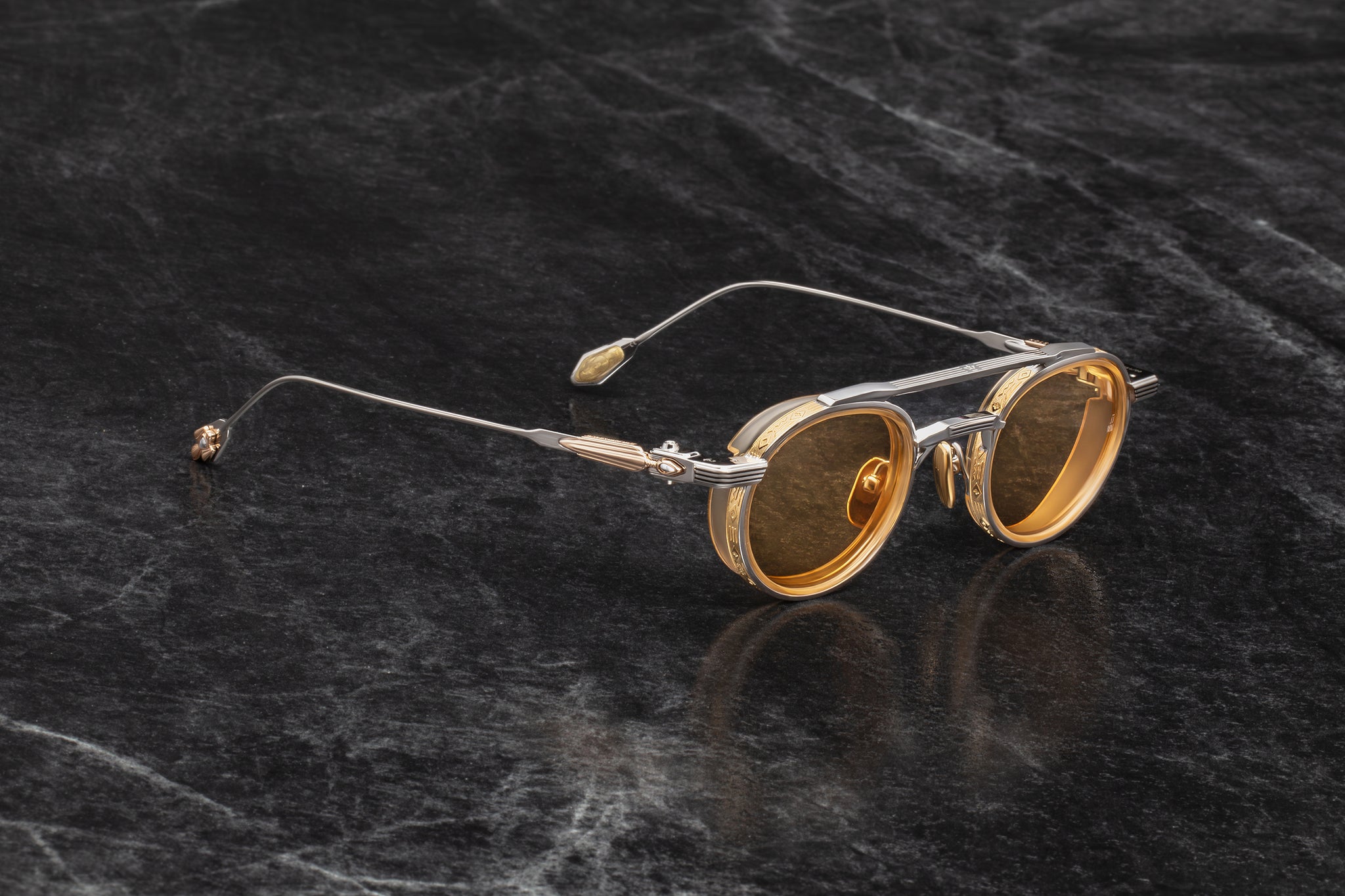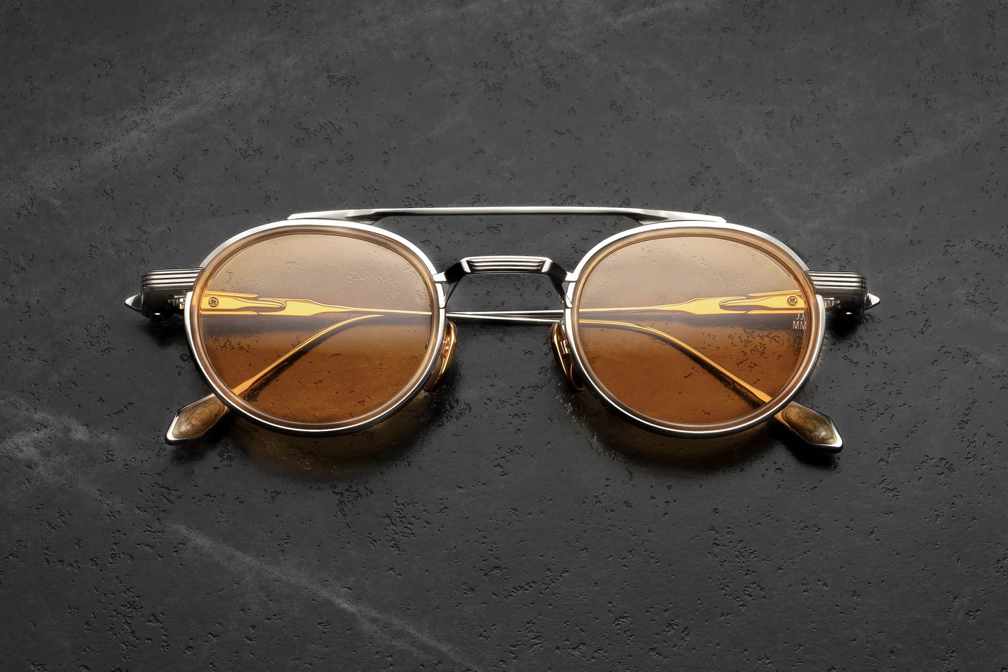 100% BETA TITANIUM SPECTACLES IN SILVER PALLADIUM WITH DARK GOLD ACCENTS, COMPLEMENTED BY 8MM ACETATE LENS-RIM INSERTS IN CRYSTAL YELLOW, AND CROWN MINERAL GLASS 4-BASE LENSES IN DANDELION WITH BACKSIDE ANTI-REFLECTIVE TREATMENT
