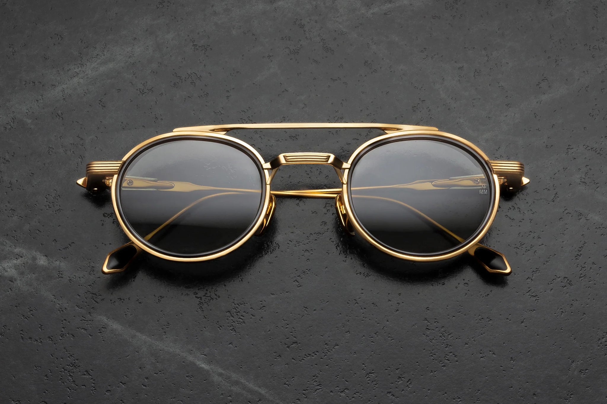 100% BETA TITANIUM SPECTACLES IN DARK GOLD WITH SILVER PALLADIUM ACCENTS, COMPLEMENTED BY 8MM ACETATE LENS-RIM INSERTS IN BLACK, AND CROWN MINERAL GLASS 4-BASE LENSES IN HARBOR WITH BACKSIDE ANTI-REFLECTIVE TREATMENT