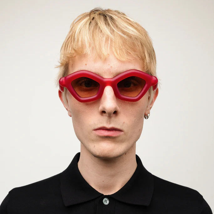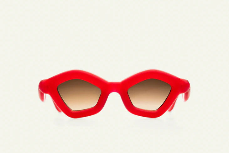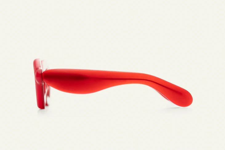 Split-finished red acetate with gradient brown lenses, sharp contrast in motion.