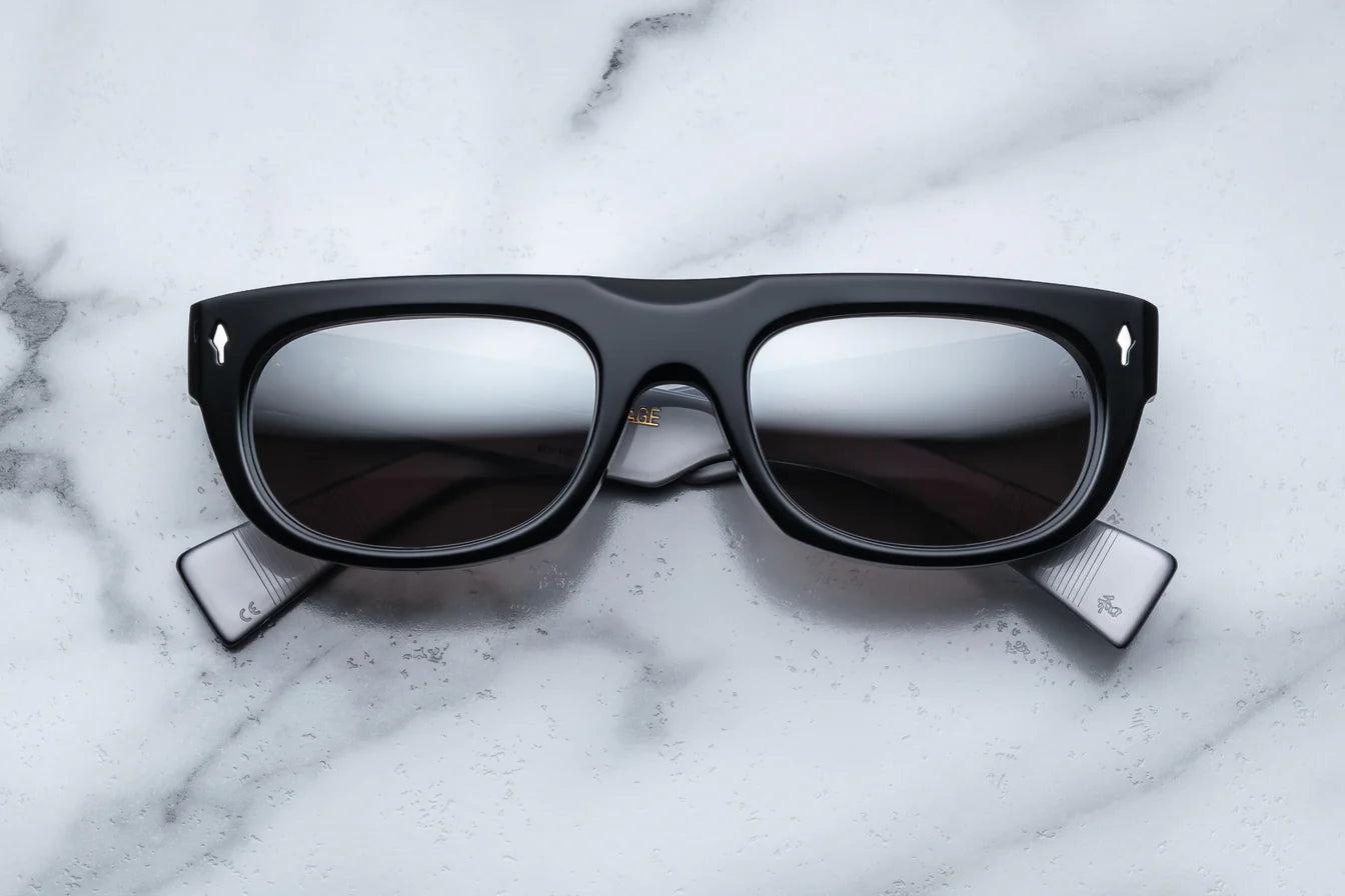 The Platinum Collector’s Box includes VICIOUS, originally released in Summer 2023. Inspired by the icy wrap-arounds worn by Lou Reed as he worked on his second solo album, Transformer (1972), these edgy and elevated spectacles have been reimagined in Polished Black, featuring temple interiors in Metallic Silver with Gold foil-stamped hallmarks, complemented by mirror lenses and our signature precious metal hardware and exposed wirecores in Silver.