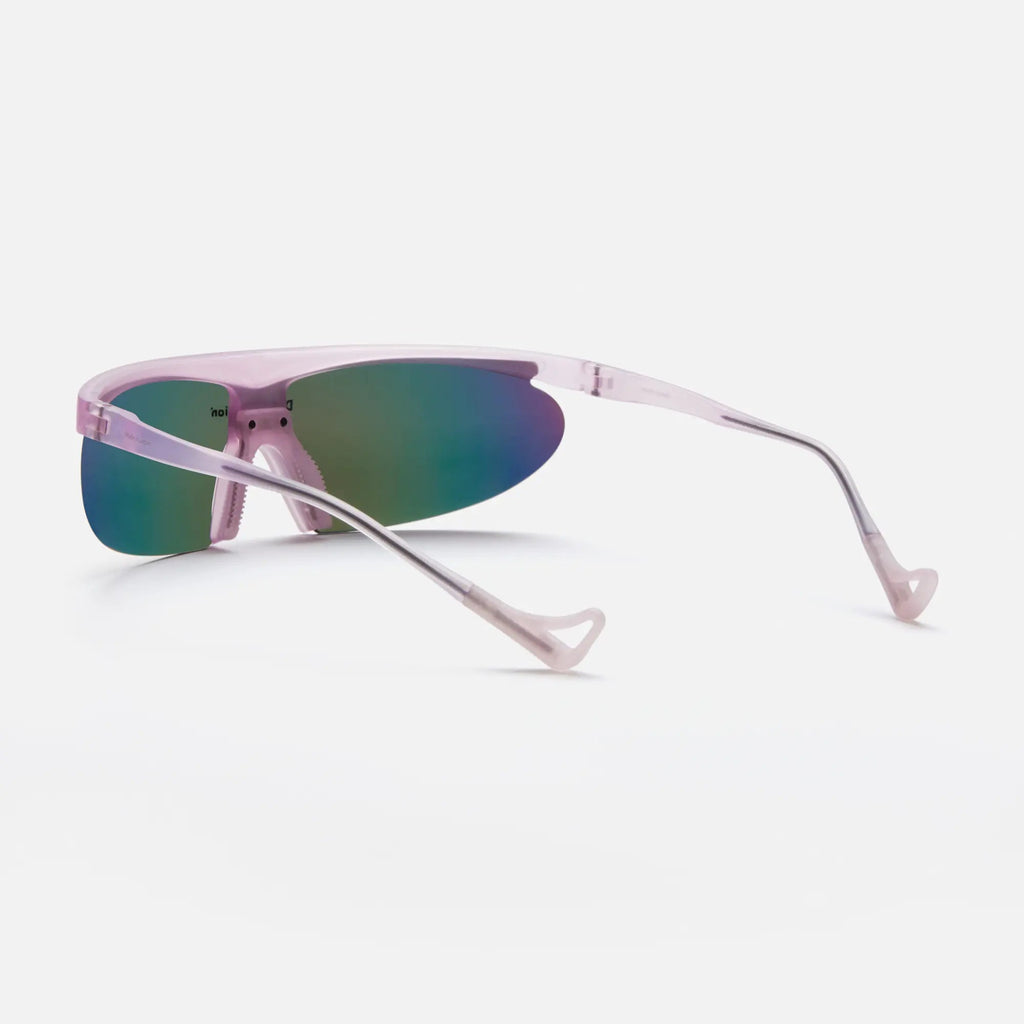 Koharu Eclipse is a six base frame construction defining a new approach to unisex sports eyewear. The ergonomic form is engineered to aid ventilation and enhance the field of vision. The 125mm temples are architected for helmet use. The frame features D+ lens technology, an adjustable hypoallergenic rubber nose pad and temple tips with a titanium core. D+ Spectral Mirror was developed for physical pursuits requiring maximum sun protection. The mirror coating facilitates additional infrared screening. The lens offers 100% UVA/B protection while transmitting 29.07% of visible light and 37.19% of blue light.