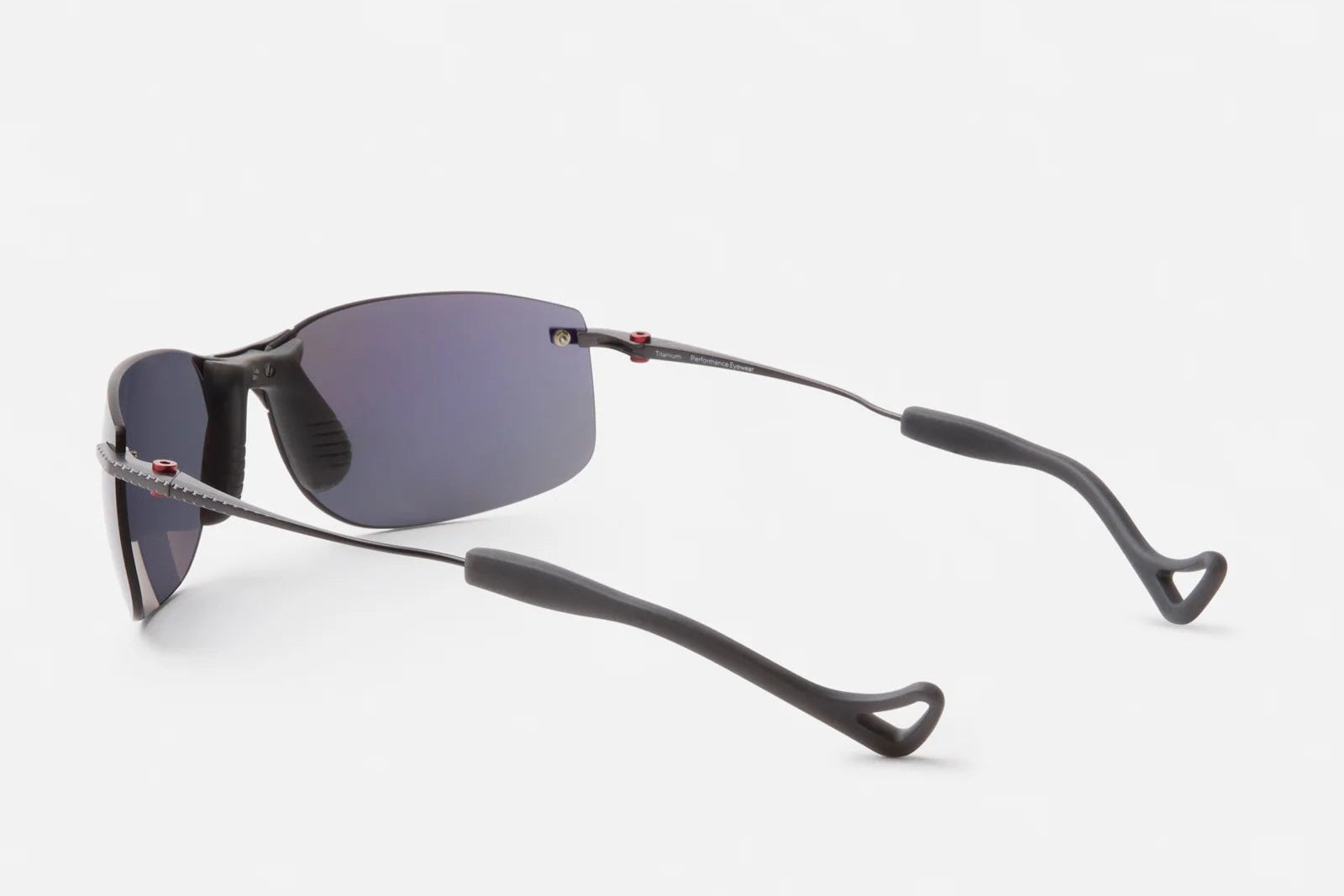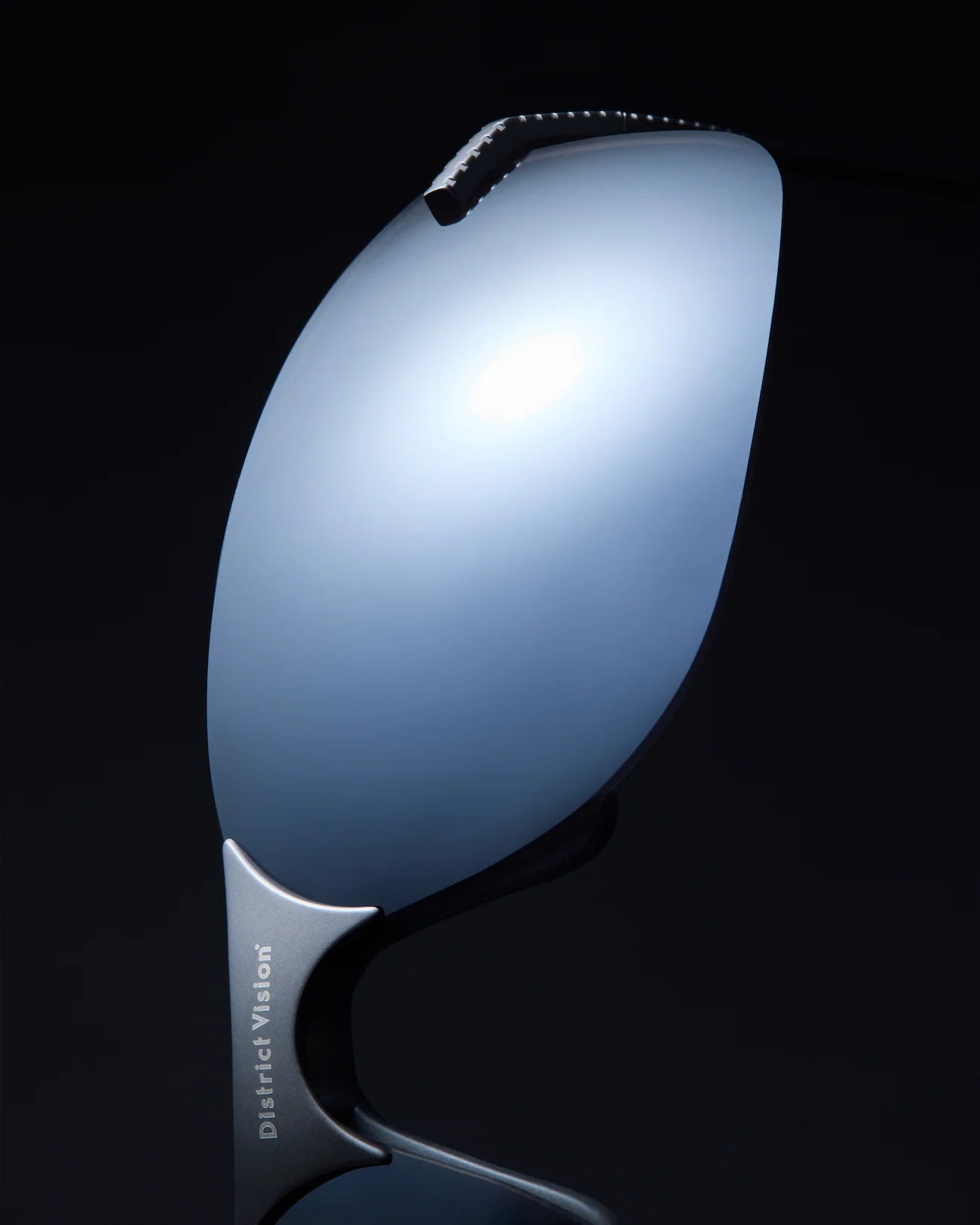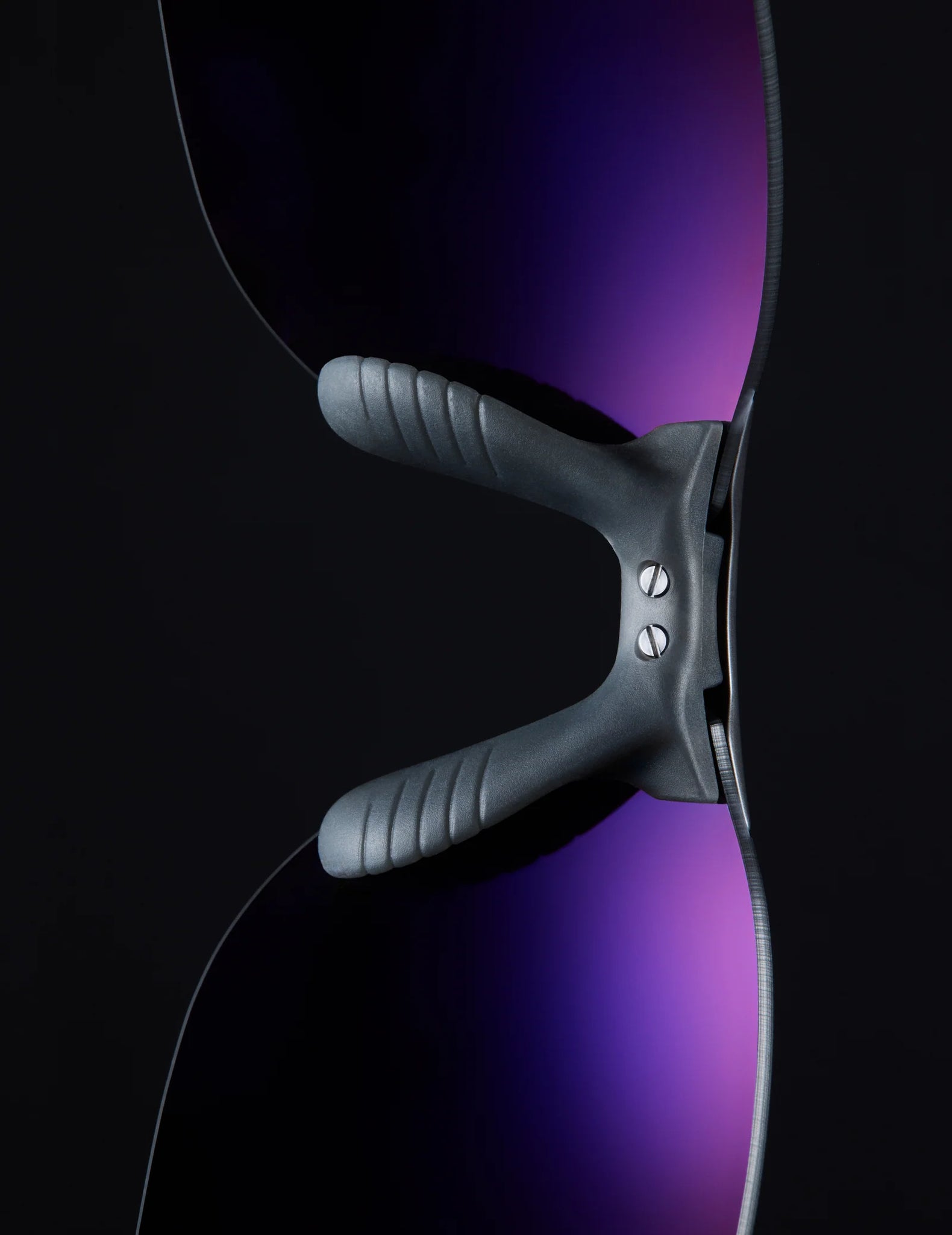 The Miho Windstream Ti is a rectangular, dual-lens, six- base rimless sunglass system built with ultra-lightweight, durable betatitanium temples. Custom anodized titanium hardware pairs with adjustable, hypoallergenic rubber nose pads and temple tips for a fully customizable fit. The frame is equipped with D+ therapeutic-grade lenses, manufactured from shatterproof polycarbonate for enhanced durability and impact resistance. The lens surface is treated with anti-reflective and oleophobic coatings to minimize glare and repel water and oil, ensuring complete protection and optimal visual clarity. D+ Onyx Mirror was developed for physical pursuits requiring maximum sun protection. The mirror coating facilitates additional infrared screening. The lens offers 100% UVA/B protection while transmitting 16.19% of visible light and 15.99% of blue light.