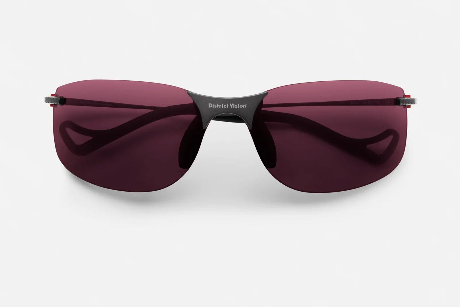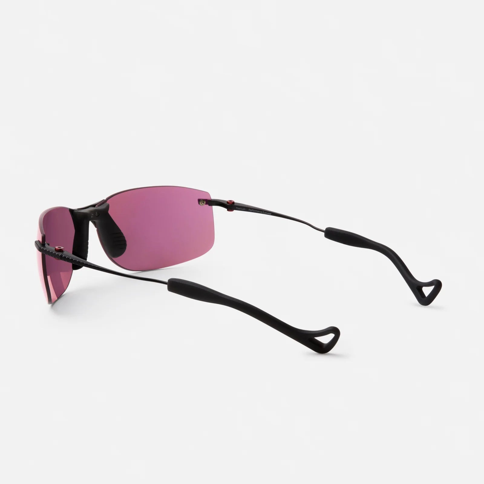 The Miho Windstream Ti is a rectangular, dual-lens, six- base rimless sunglass system built with ultra-lightweight, durable betatitanium temples. Custom anodized titanium hardware pairs with adjustable, hypoallergenic rubber nose pads and temple tips for a fully customizable fit. The frame is equipped with D+ therapeutic-grade lenses, manufactured from shatterproof polycarbonate for enhanced durability and impact resistance. The lens surface is treated with anti-reflective and oleophobic coatings to minimize glare and repel water and oil, ensuring complete protection and optimal visual clarity. D+ Black Rose is an advanced sports lens engineered for trail running and physical pursuits that involve variable light conditions. The lens allows 15.67% of visible light transmittance. The lens also offers 100% UVA/B protection while transmitting 14.19% of blue light.