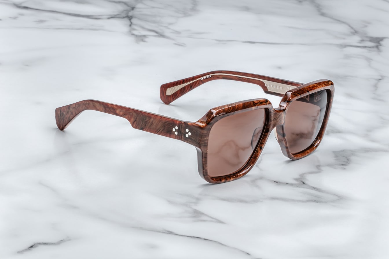 BROWN 8MM CURED CELLULOSE ACETATE FRAME WITH CUSTOM DOUBLE LAMINATED ACETATE TEMPLES FEATURING PRECIOUS METAL HARDWARE AND BROWN LENSES