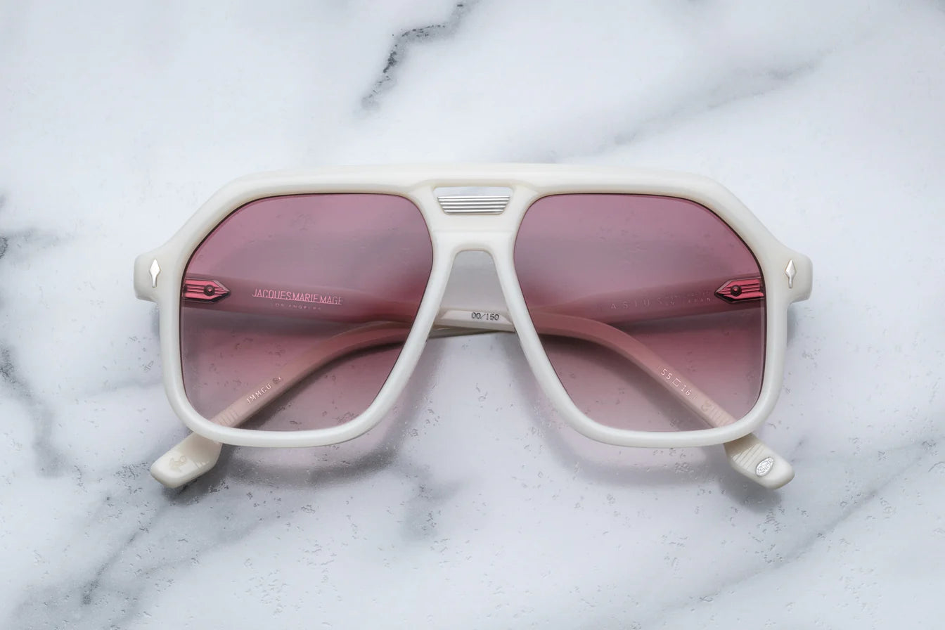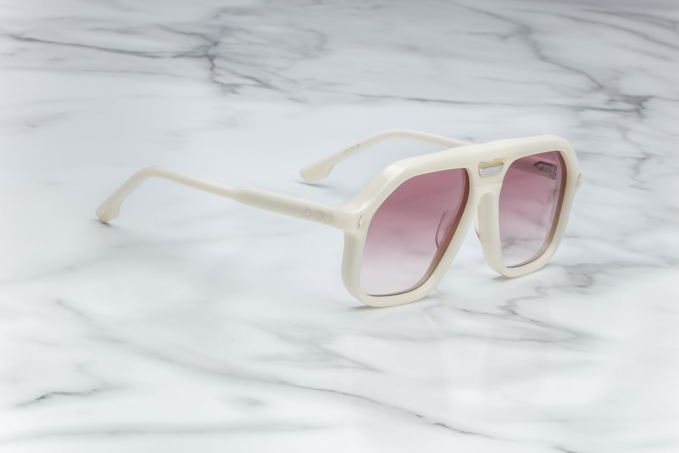 WHITE 10MM CURED CELLULOSE ACETATE FRAME WITH CUSTOM DOUBLE LAMINATED ACETATE TEMPLES FEATURING PRECIOUS METAL HARDWARE AND RED GRADIENT LENSES