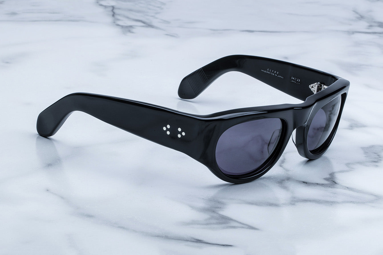 MATERIAL: 10MM BLOCK, POLISHED BLACK ACETATE FRAME, CUSTOM DOUBLE LAMINATED ACETATE TEMPLES FT. PRECIOUS METAL HARDWARE