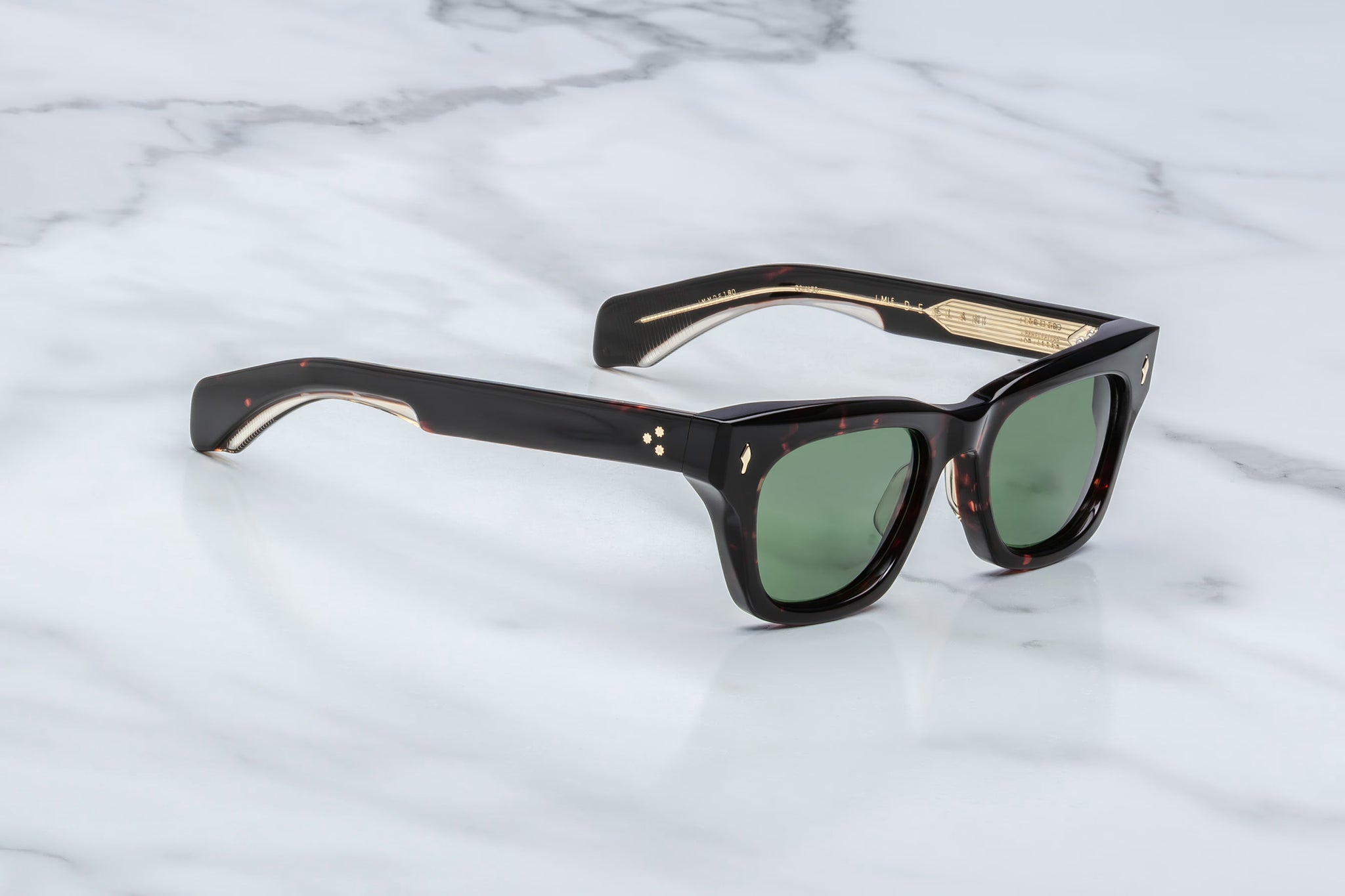 HAVANA 10MM CURED CELLULOSE ACETATE FRAME WITH CUSTOM DOUBLE LAMINATED ACETATE TEMPLES AND GREEN LENSES