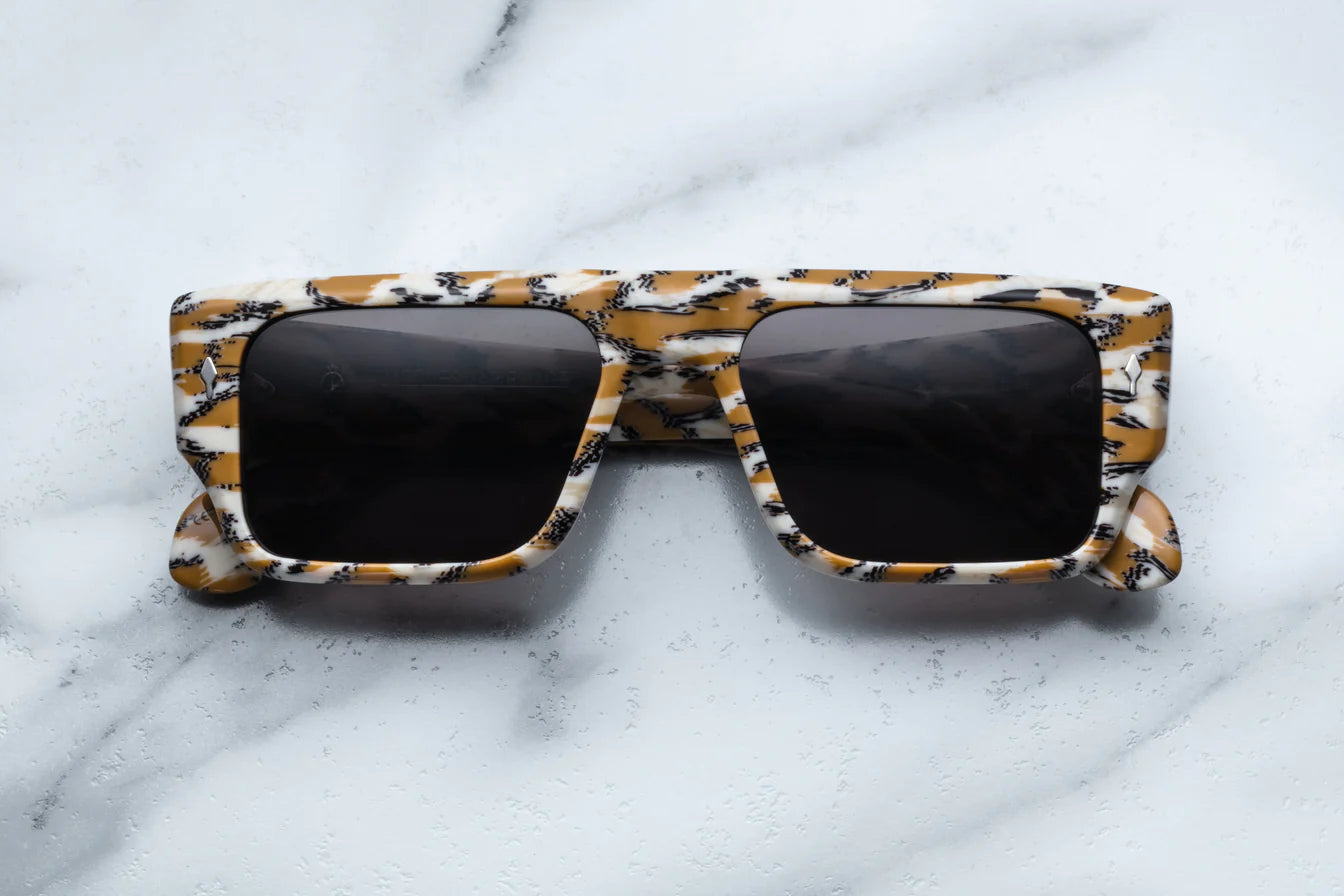 PATTERN 9MM CURED CELLULOSE ACETATE FRAME WITH CUSTOM ACETATE TEMPLES AND GREY LENSES
