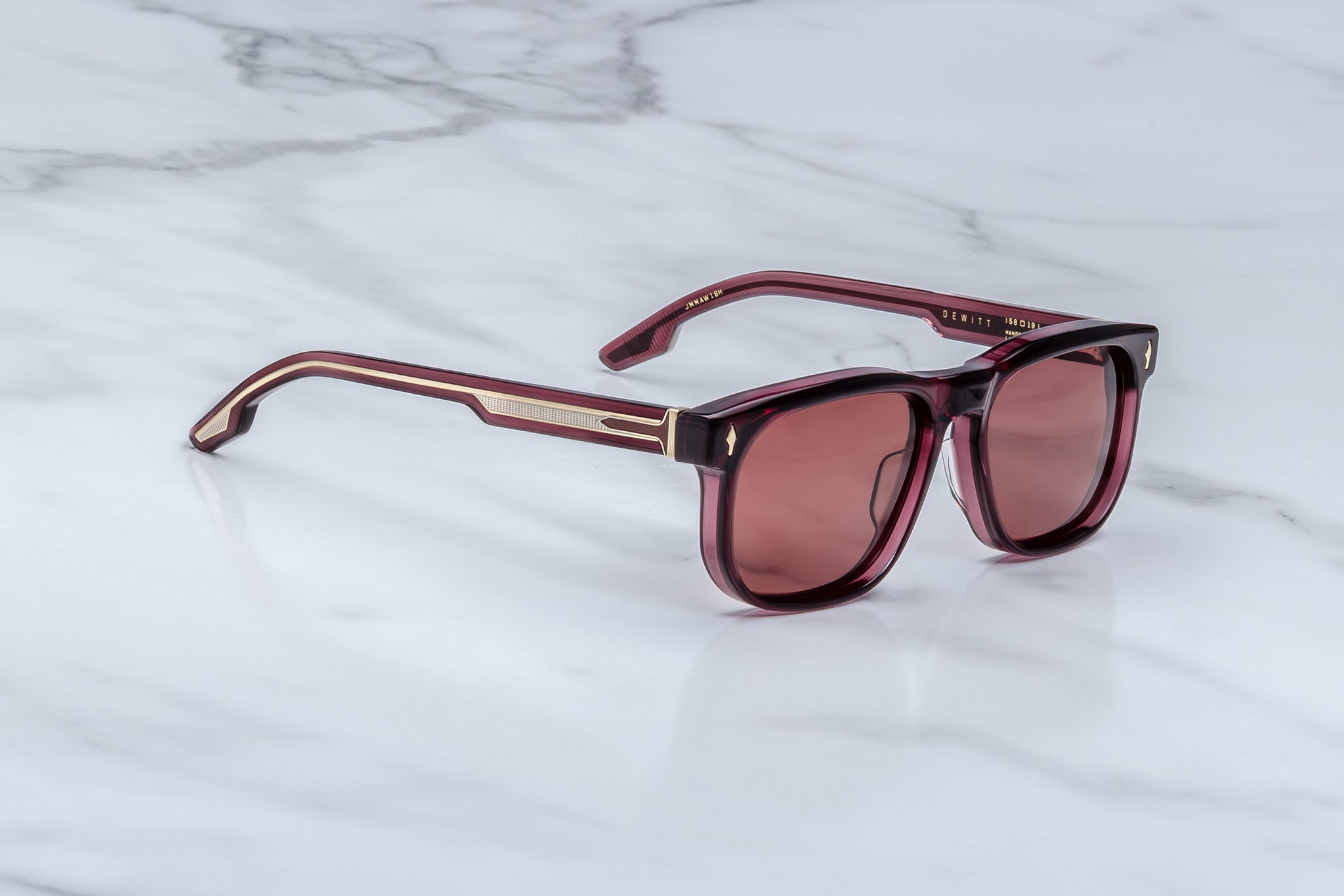 RED 10MM CURED CELLULOSE ACETATE FRAME WITH CUSTOM DOUBLE-LAMINATED ACETATE TEMPLES FEATURING PRECIOUS METAL HARDWARE AND RED LENSES