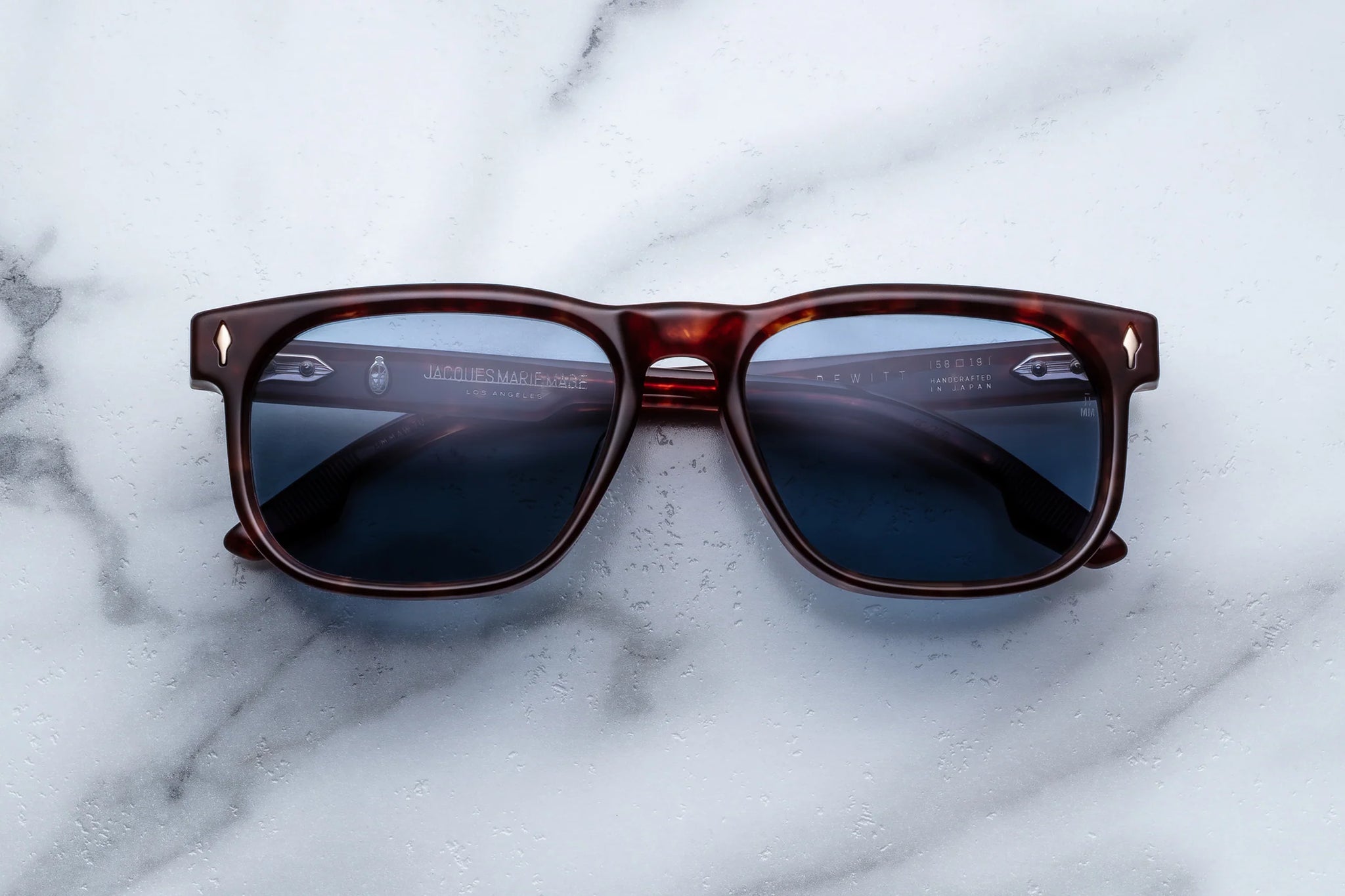 HAVANA 10MM CURED CELLULOSE ACETATE FRAME WITH CUSTOM ACETATE TEMPLES FEATURING PRECIOUS METAL HARDWARE AND BLUE LENSES