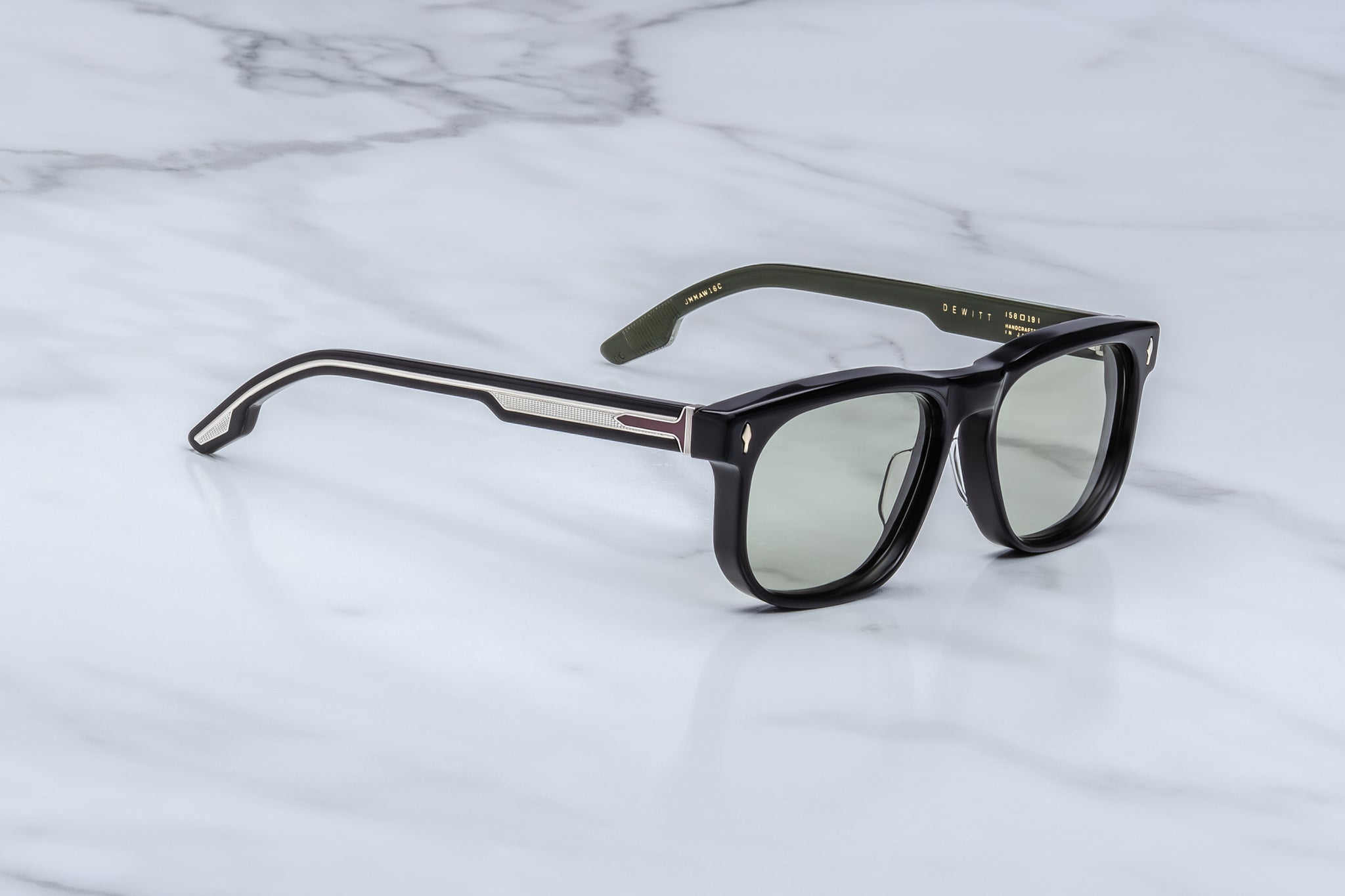 BLACK 10MM CURED CELLULOSE ACETATE FRAME WITH CUSTOM TRIPLE-LAMINATED ACETATE TEMPLES FEATURING PRECIOUS METAL HARDWARE AND GREEN LENSES
