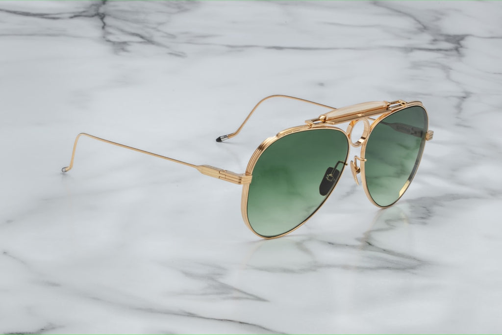 DARK GOLD 100% BETA TITANIUM FRAME WITH NUDE CURED CELLULOSE ACETATE ACCENT AND GREEN GRADIENT LENSES