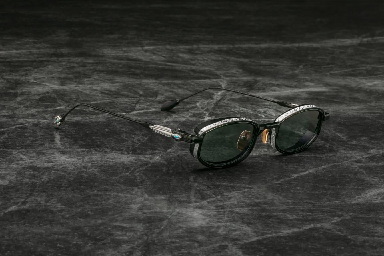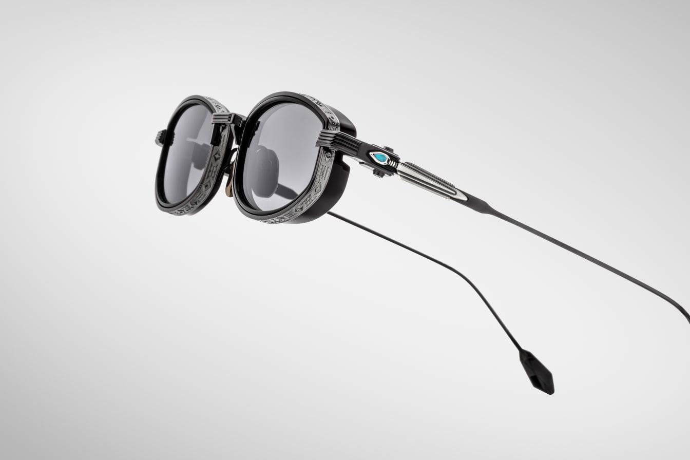 Experience the freedom of the open road in first-of-their-kind spectacles accustomed to majestic canyon views mingling amidst rugged mountains, rolling hills, and semi-arid plains, where sentiments like sediments form floodplains full of history and lore, a pageantry of past lives and lasting loves swept into the fore. These ’50s-inspired spectacles feature titanium eye rims with finely-engraved Chimayo-inspired designs, extended acetate eye shields, an artistic arrowhead temple motif plated in 18k Gold or Sterling Silver with turquoise inlays, and ‘thunderbird’ medallions plated in 18k Gold or Sterling Silver at the temple tips, featuring turquoise inlays.
