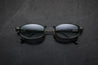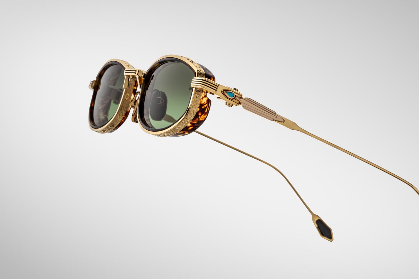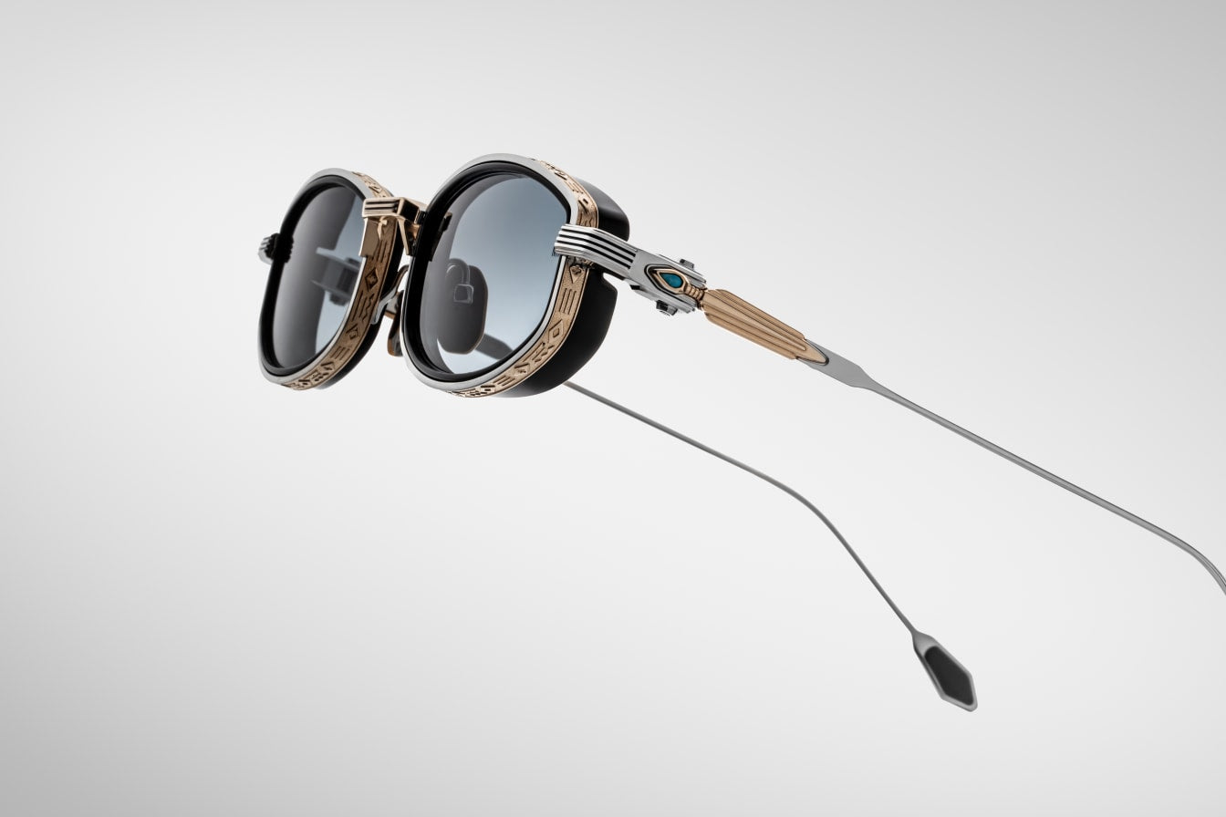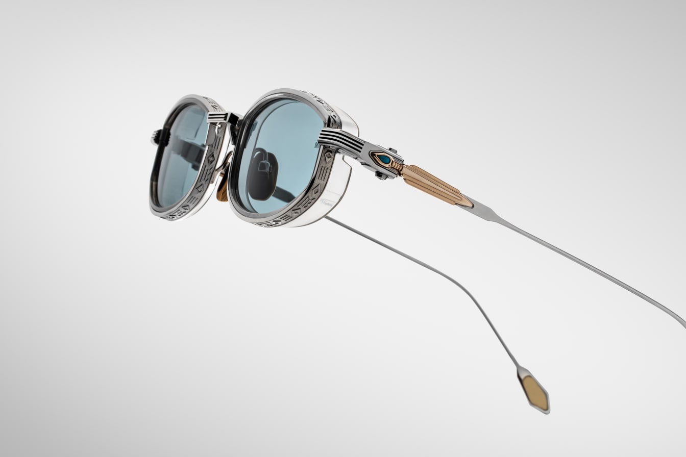 From the first Last Frontier titanium series, these oval ’50s-inspired glasses feature finely engraved eye-rims and extended acetate eye shields, complemented by sculptural precious metal arrowhead temple motif complemented by polished ‘thunderbird’ cameos at the temple tips, embellished with hand-shaped gemstone inlays.