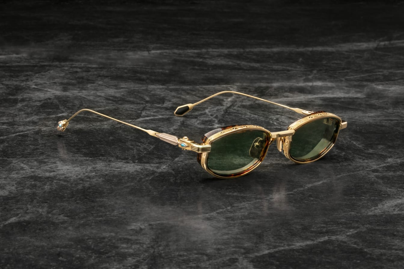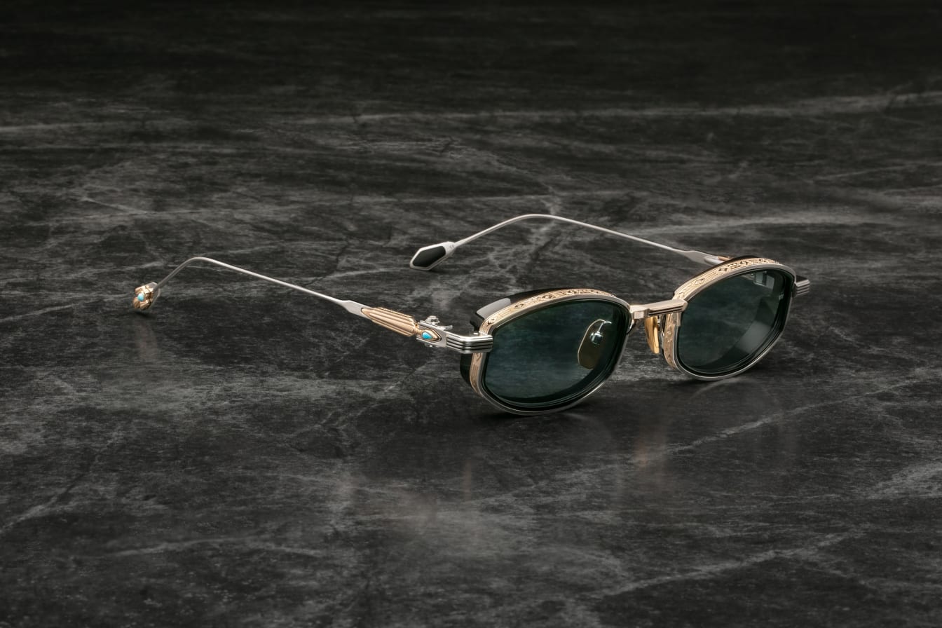 From the first Last Frontier titanium series, these oval ’50s-inspired glasses feature finely engraved eye-rims and extended acetate eye shields, complemented by sculptural precious metal arrowhead temple motif complemented by polished ‘thunderbird’ cameos at the temple tips, embellished with hand-shaped gemstone inlays.