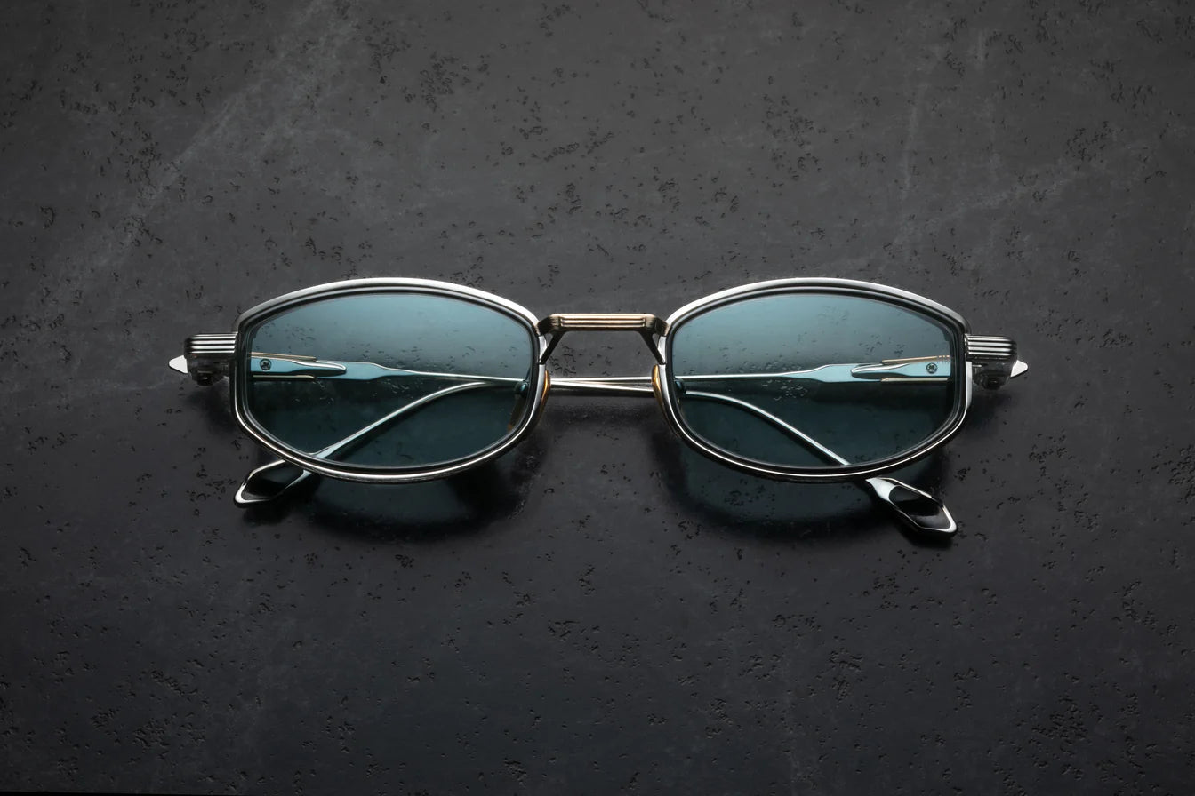 SILVER AND GOLD 100% BETA TITANIUM FRAME WITH BLACK CURED CELLULOSE ACETATE AND BLUE GRADIENT LENSES