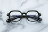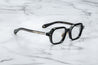 BLACK 10MM CURED CELLULOSE ACETATE FRAME WITH CUSTOM DOUBLE-LAMINATED ACETATE TEMPLES FEATURING PRECIOUS METAL HARDWARE AND LIGHT GREEN LENSES
