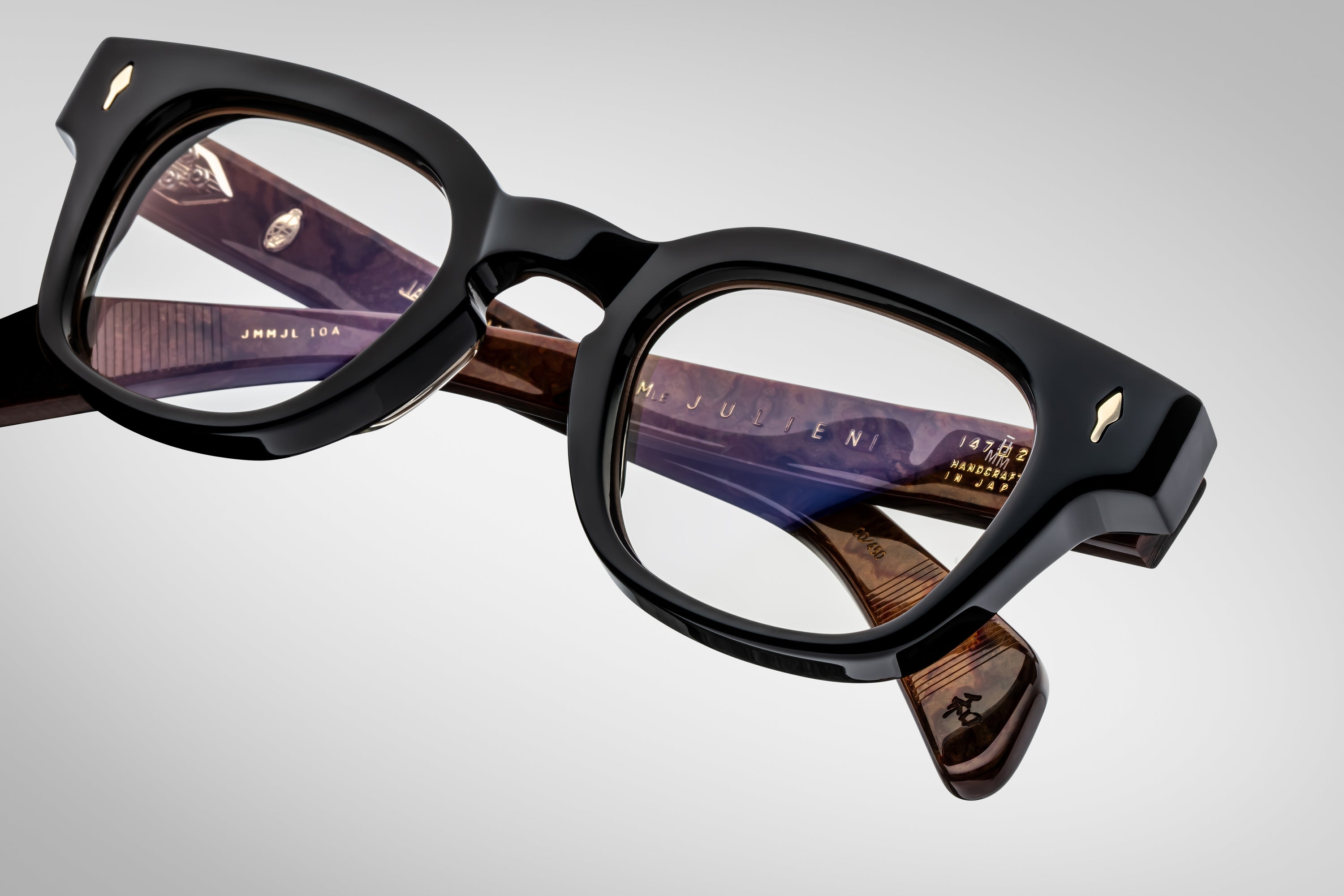 BLACK 10MM CURED CELLULOSE ACETATE FRAME CUSTOM DOUBLE LAMINATED ACETATE TEMPLES FEATURING PRECIOUS METAL HARDWARE AND SUPERLIGHT BRONZE LENSES