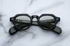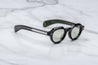 BLACK 10MM CELLULOSE ACETATE FRAME CUSTOM ACETATE TEMPLES FEATURING PRECIOUS METAL HARDWARE AND GREEN LENSES