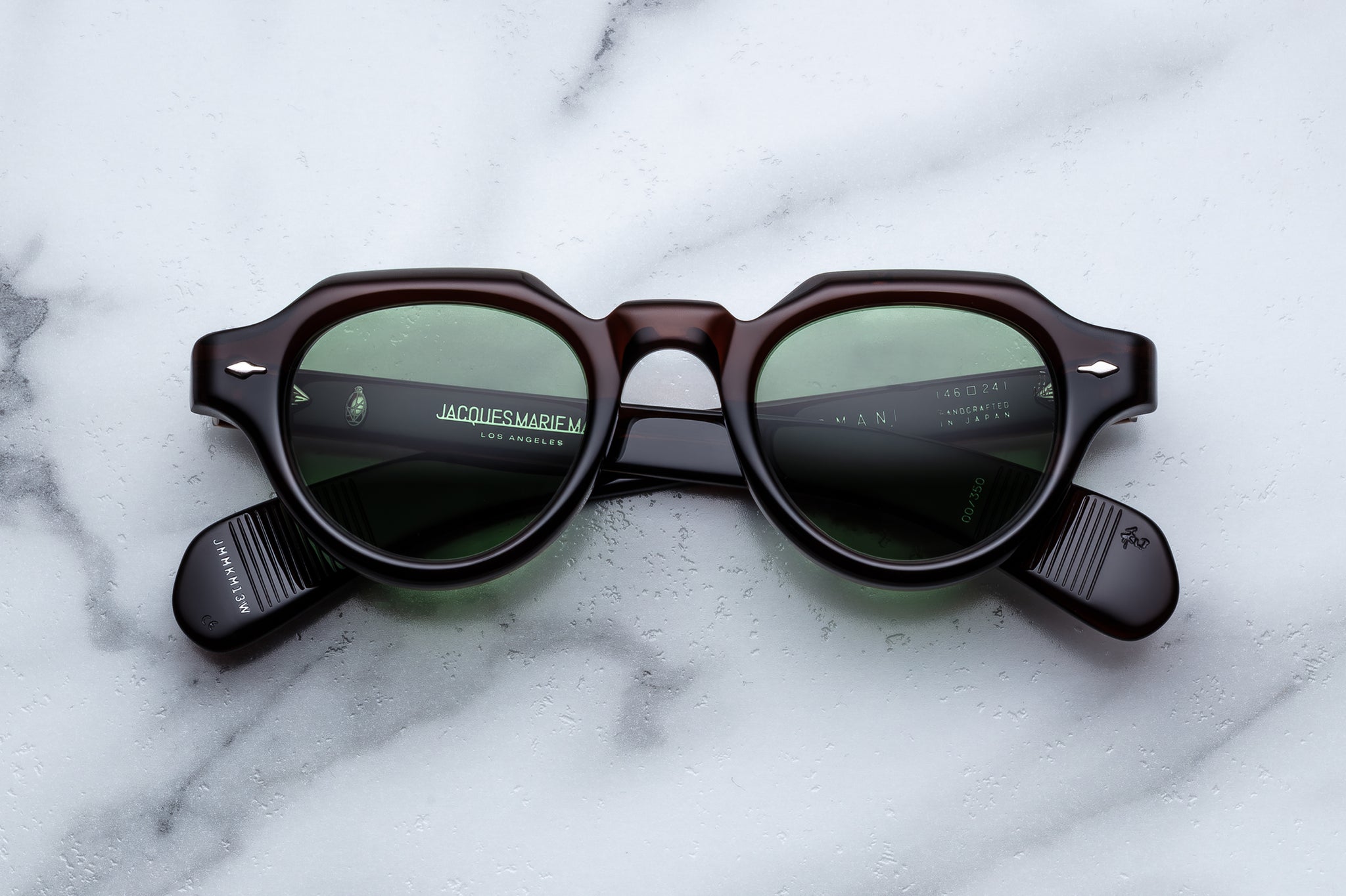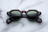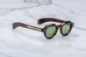 BROWN 10MM CELLULOSE ACETATE FRAME CUSTOM ACETATE TEMPLES FEATURING PRECIOUS METAL HARDWARE AND GREEN LENSES