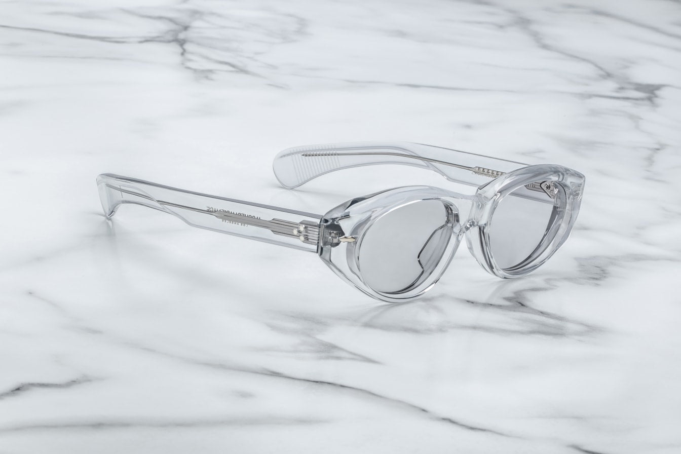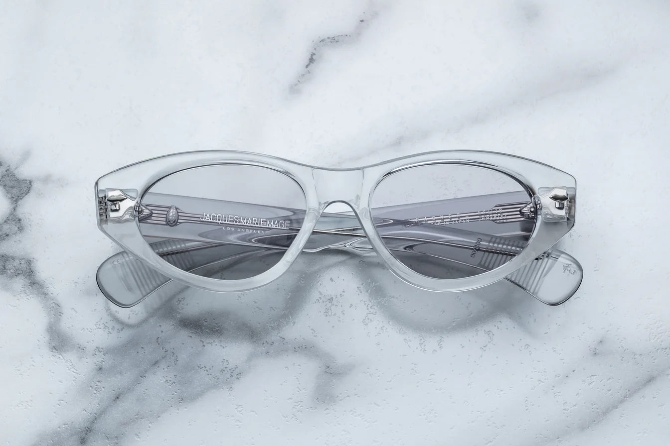 CRYSTAL 10MM CURED CELLULOSE ACETATE FRAME WITH CUSTOM DOUBLE LAMINATED ACETATE TEMPLES FEATURING PRECIOUS METAL HARDWARE AND GREY LENSES