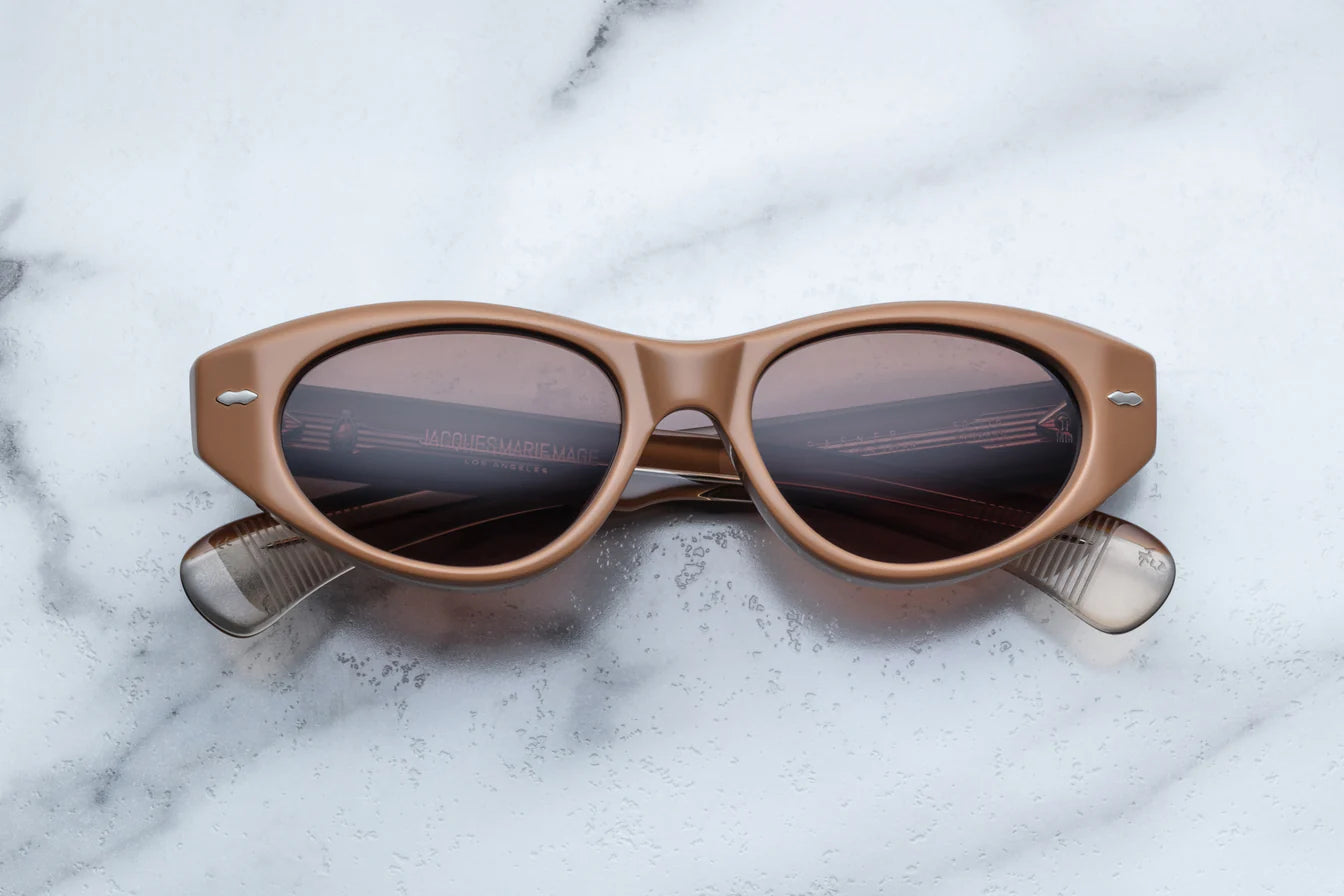 BROWN 10MM CURED CELLULOSE ACETATE FRAME WITH CUSTOM DOUBLE LAMINATED ACETATE TEMPLES FEATURING PRECIOUS METAL HARDWARE AND BROWN LENSES
