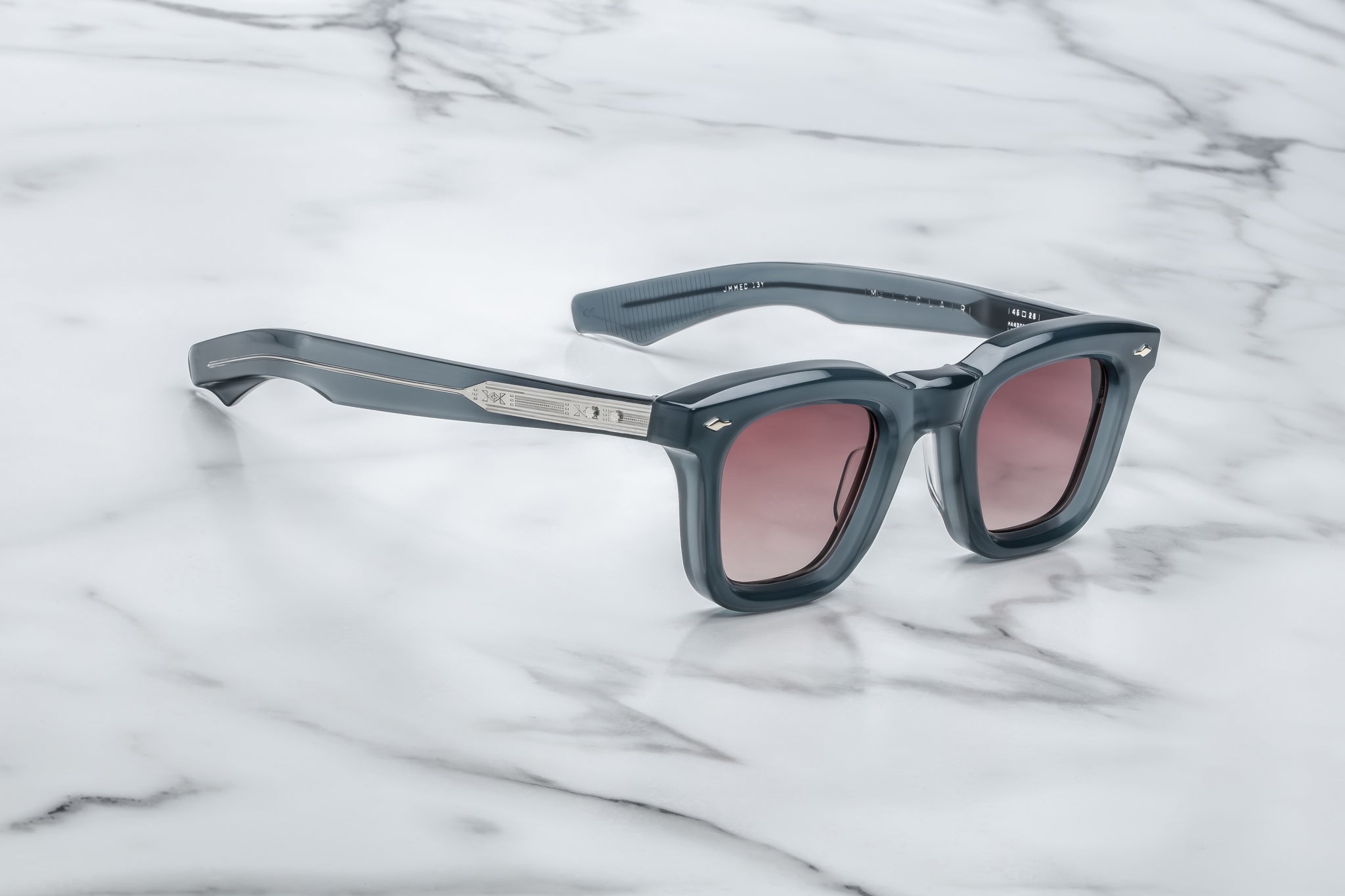 GREY 10MM CURED CELLULOSE ACETATE FRAME WITH CUSTOM DOUBLE LAMINATED ACETATE TEMPLES FEATURING PRECIOUS METAL HARDWARE AND PINK LENSES