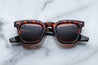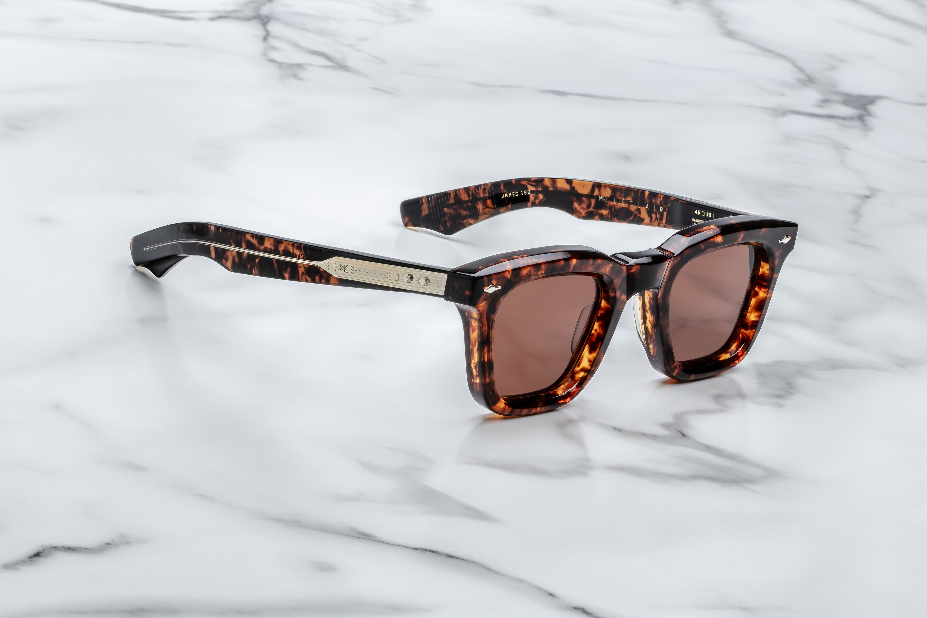 HAVANA 10MM CURED CELLULOSE ACETATE FRAME WITH CUSTOM DOUBLE LAMINATED ACETATE TEMPLES FEATURING PRECIOUS METAL HARDWARE AND BROWN LENSES